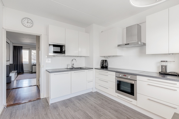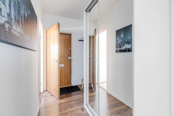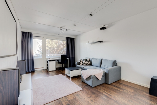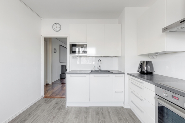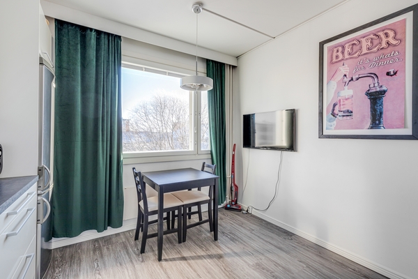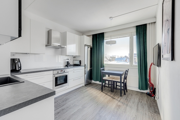 Puuvillan ostoskeskuksen läheisyydestä läpitalon kaksio vaikka ensiasunnoksi. Vaalea sävyinen keittiö.