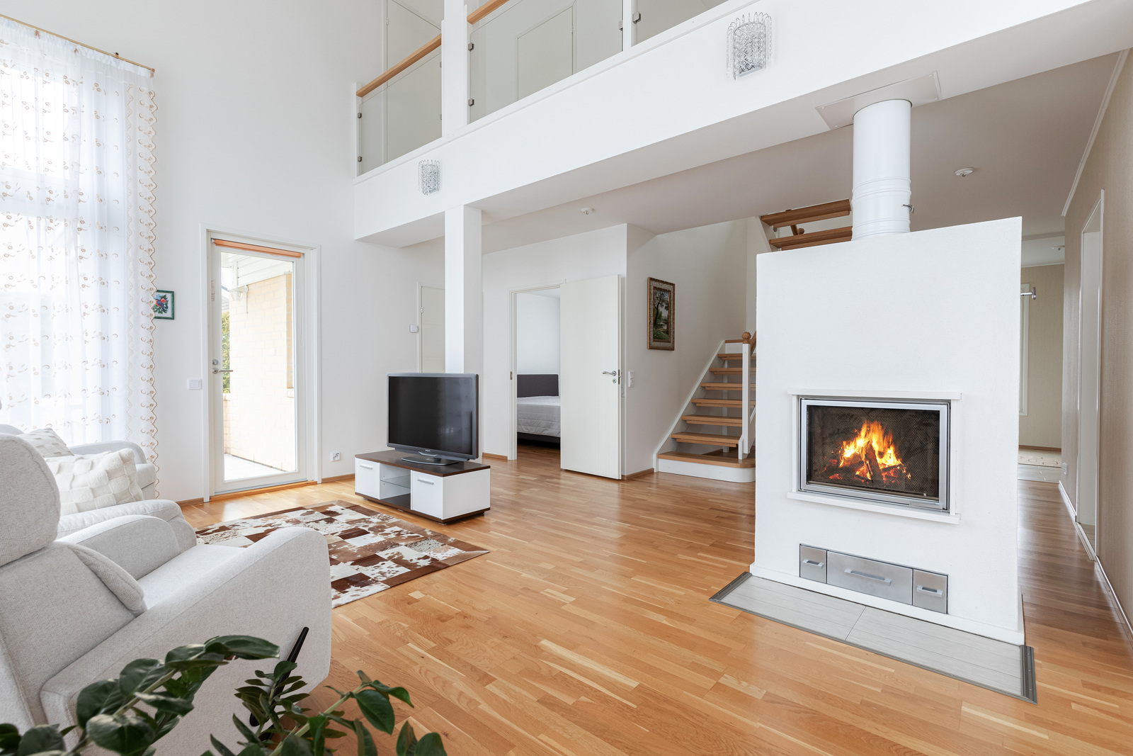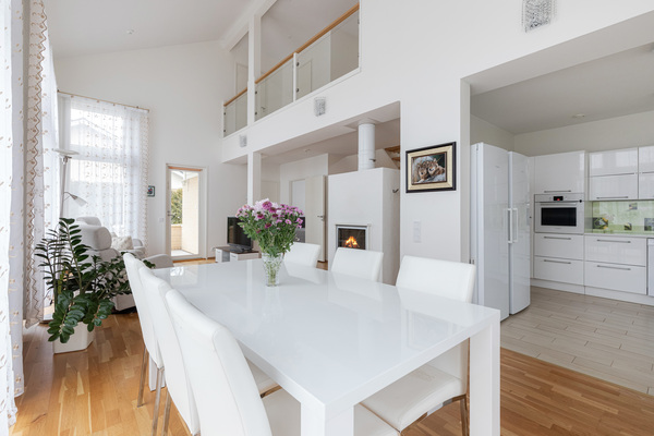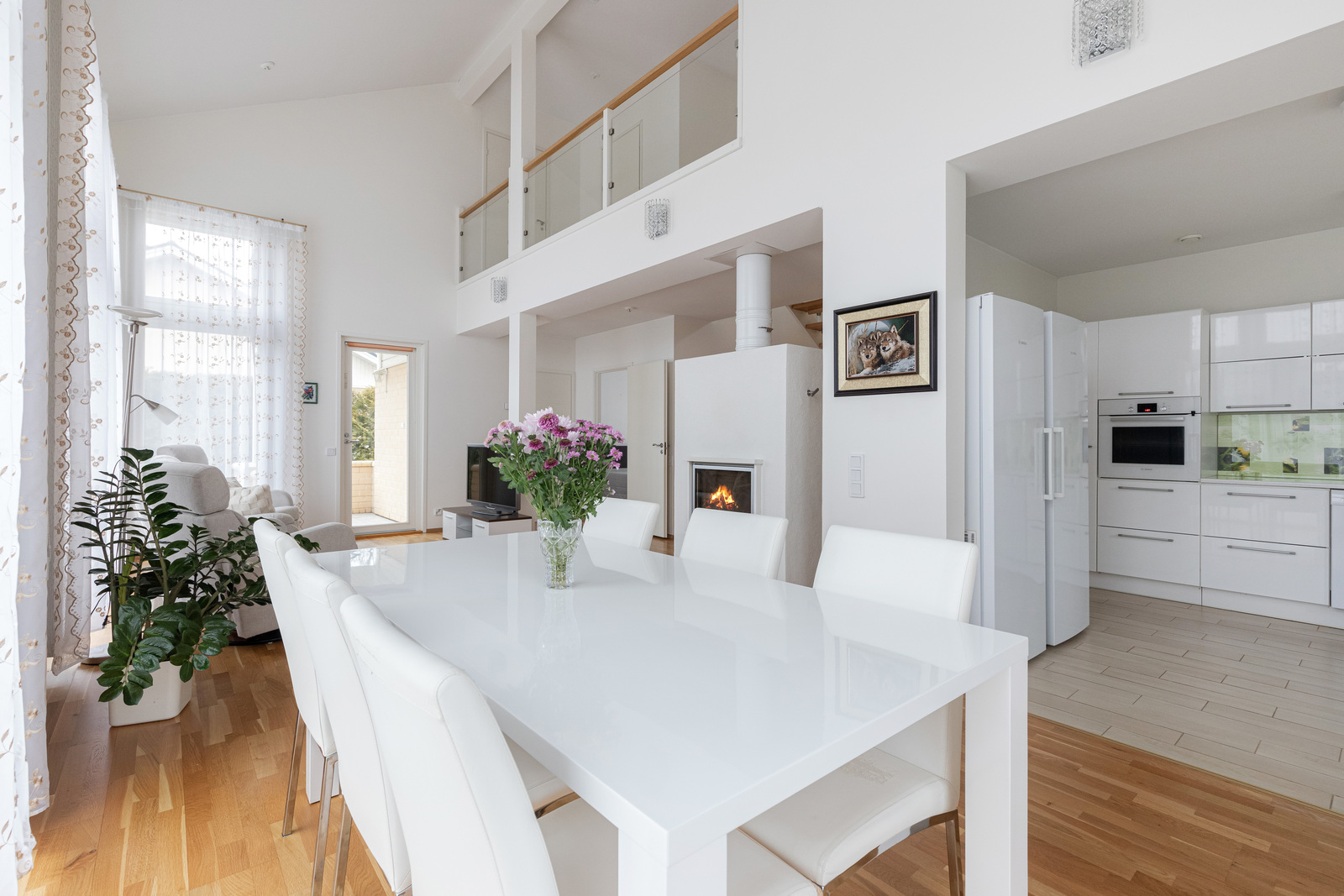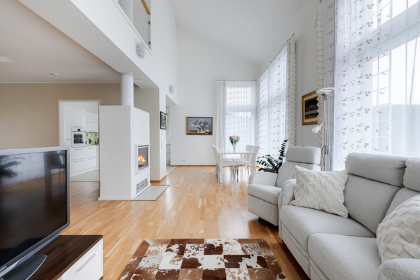 Asunnon sydämenä toimii näyttävä olohuone, jossa on korkeaa tilaa yläkertaan asti. Suuret ikkunapinnat tuovat tilaan upeasti luonnonvaloa ja lisäävät avaruuden tuntua. Olohuone yhdistyy luontevasti keittiöön, luoden viihtyisän kokonaisuuden niin arkeen kuin juhlaan.