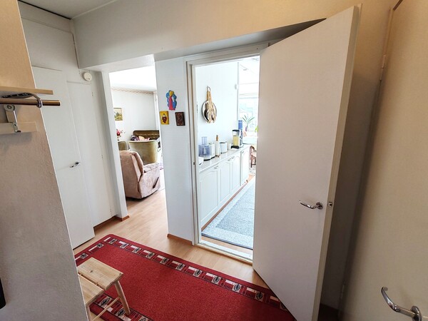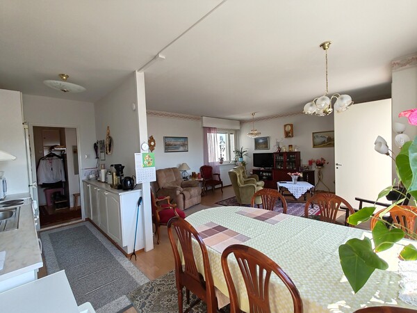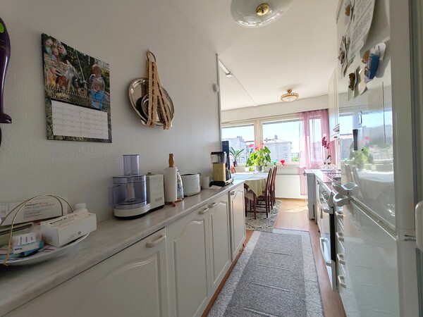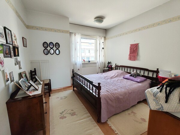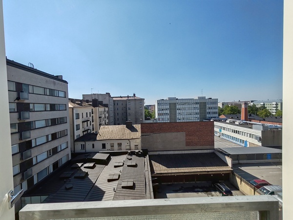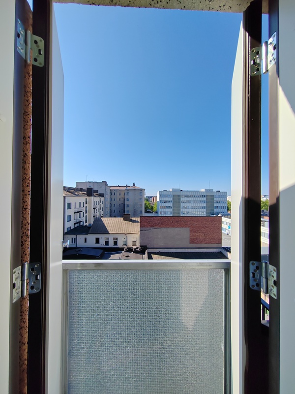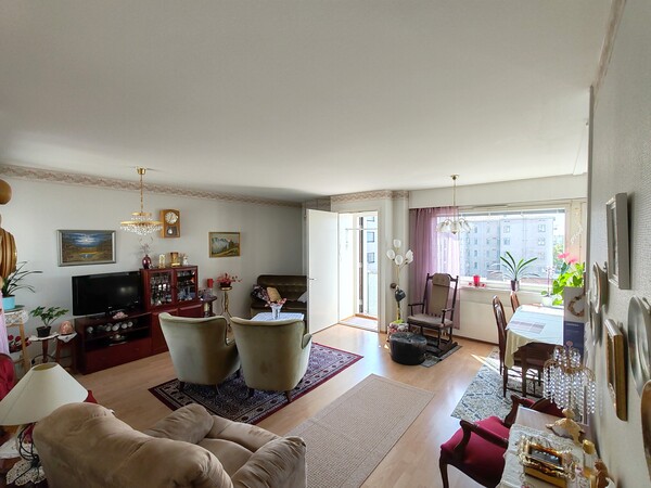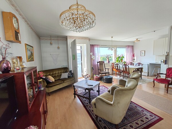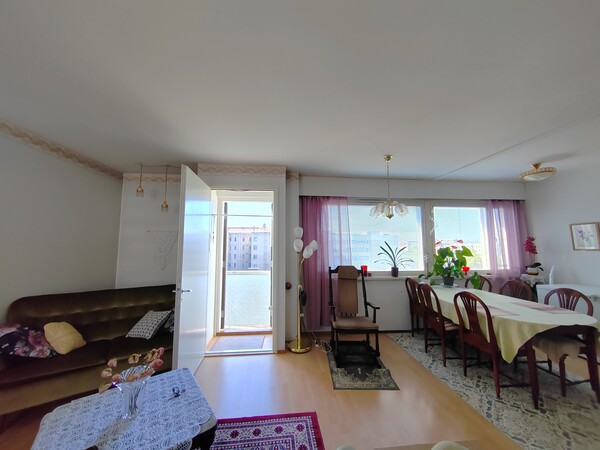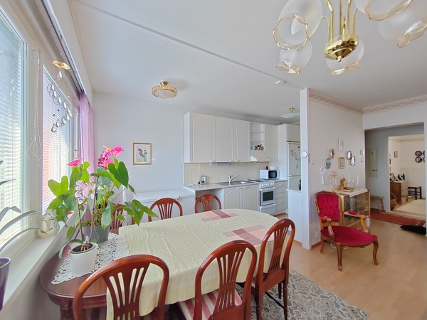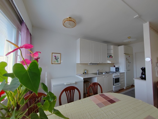 Pohjaratkaisu on tosi kiva, keittiö ruokailutilan kautta auki olohuoneeseen joten oleskelutilat ovat tilavat ja avarat, makuuhuone on iso ja siellä vaatehuone. Olohuoneesta avautuu ranskalainen parveke etelään sisäpihalle päin josta hyvät näkymät, ei heti toista taloa edessä.