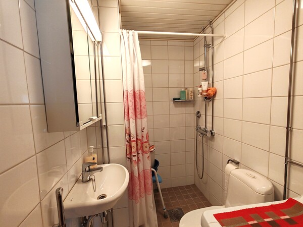 Kylpyhuone on laatoitettu linjasaneerauksen yhteydessä joka on perinteisesti tehty eli ei huolta putkiremonteistakaan.