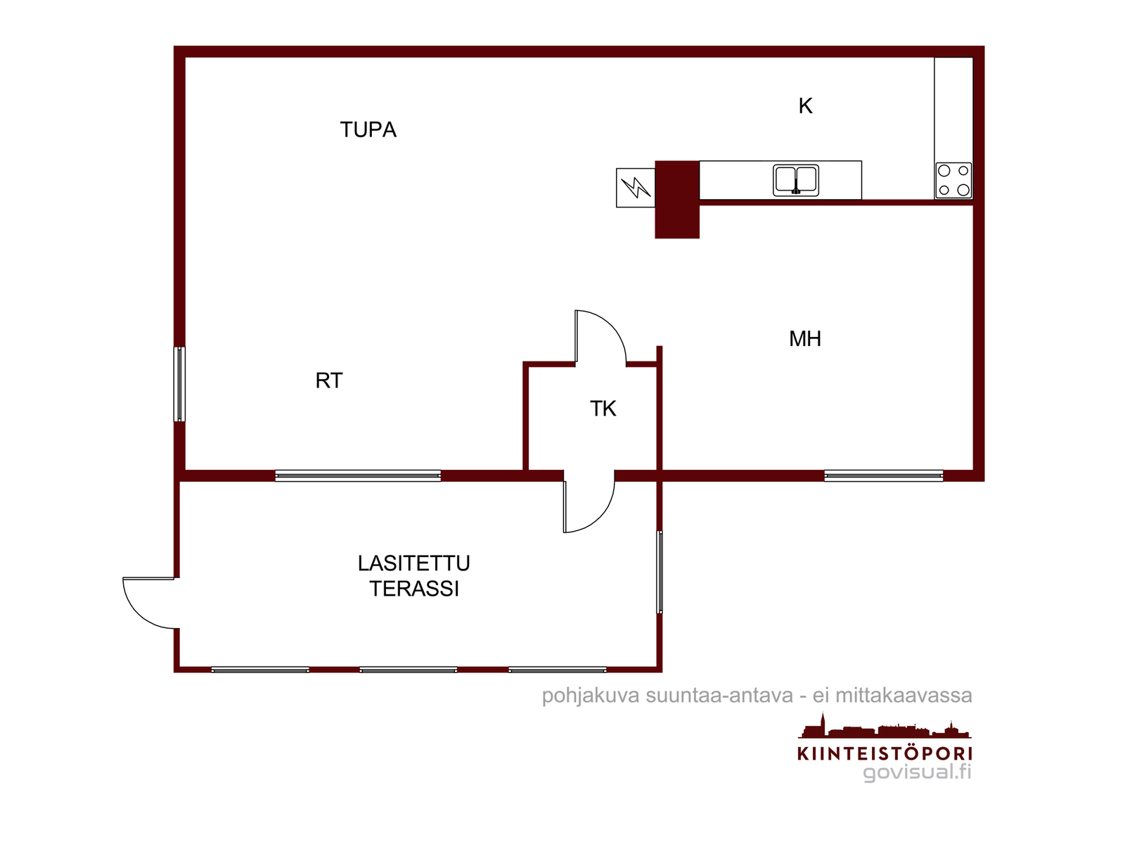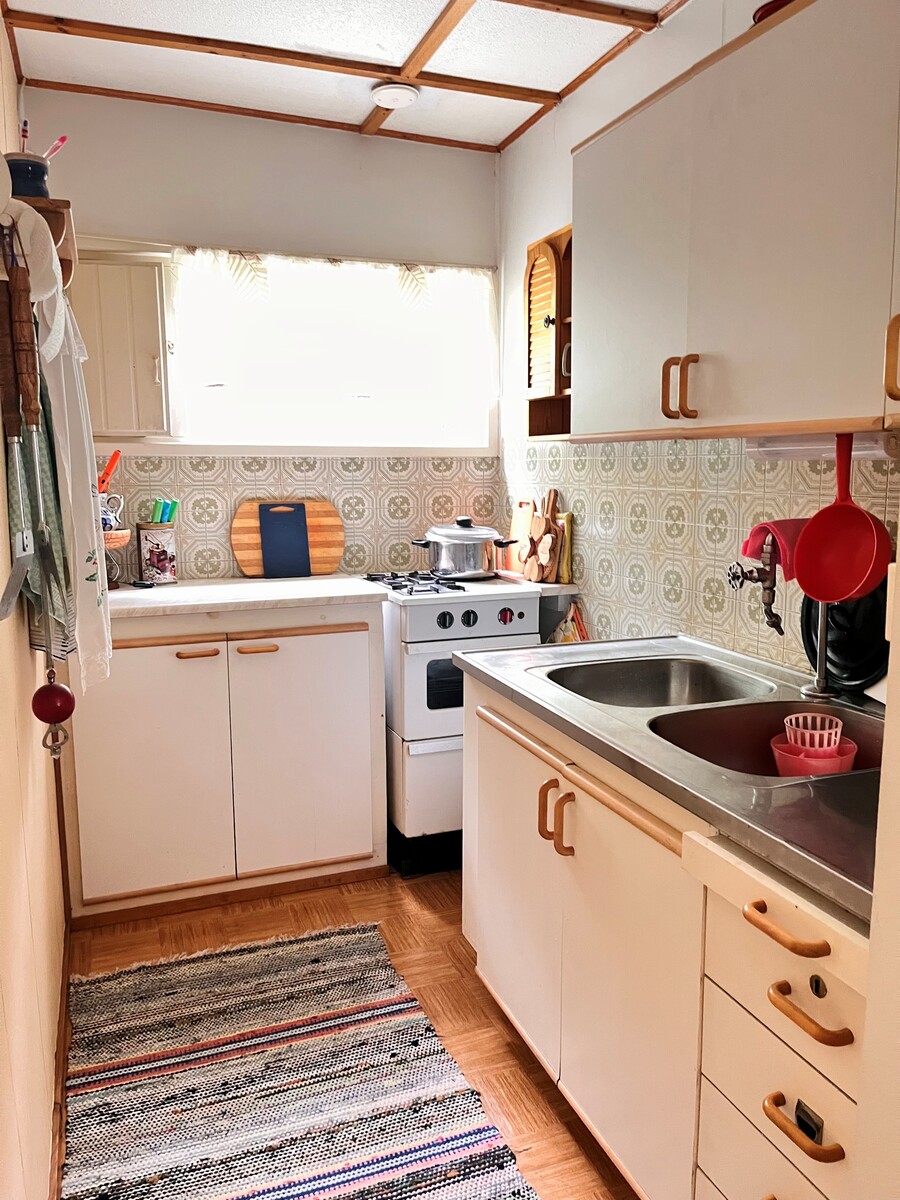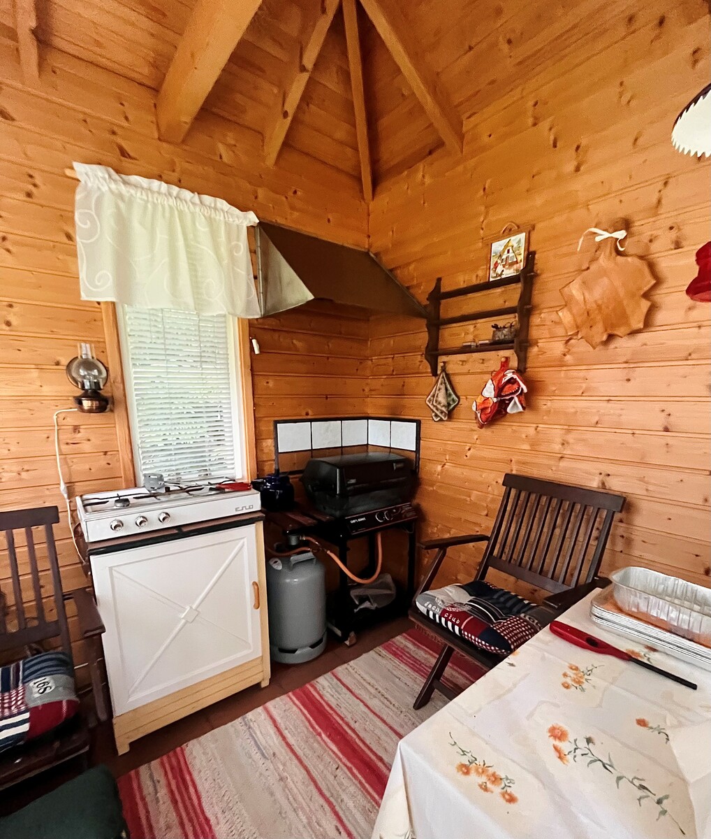 Päämökissä on keittiö, jossa kaasulla toimivat mökkiuuni ja jääkaappi. Tuvassa lämpöä ja tunnelmaa tuo varaava takka. Lisäksi mökissä on makuuhuone sekä lasitettu terassi, josta avautuvat upeat näkymät järvelle. Aurinkopaneeli tuottaa sähköt valaistukseen ja lämmittää tiskiveden joka tulee mökkiin omasta kaivosta.