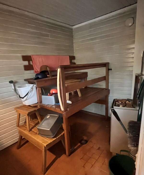 Saunarakennus tarjoaa puulämmitteisen kiukaan ja vesipadan. Pihapiiristä löytyy myös autotalli ja kesähuone.