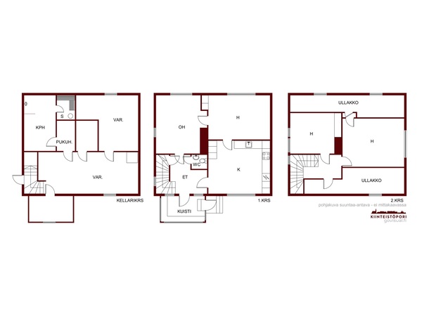 Tiloina tästä kodista löytyy keittiö, olohuone ja makuuhuone sekä wc , yläkerrassa on 2 makuuhuonetta ja vinttitilat. Kellarikerroksessa on kylpyhuoneosasto ja runsaasti työ/varastototilaa.