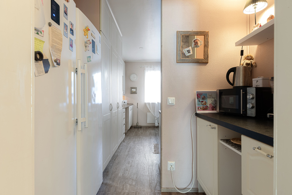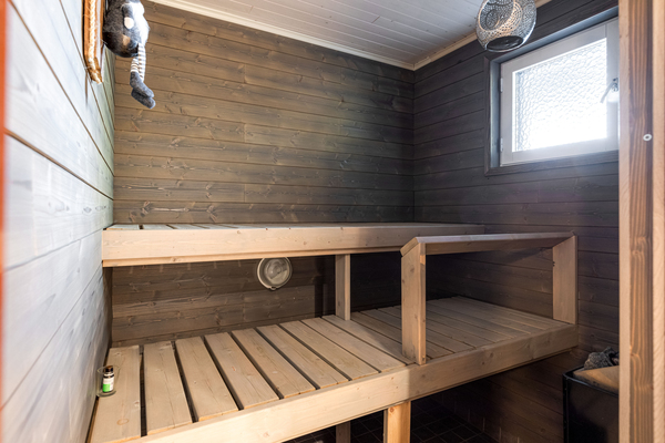 Asunnon yhteydessä on kylmä varasto, johon saa vaikka takkapuut ja polkupyörät. Tien vieressä on myös pieni autotalli jokaiselle asunnolle.