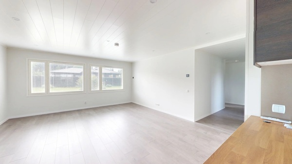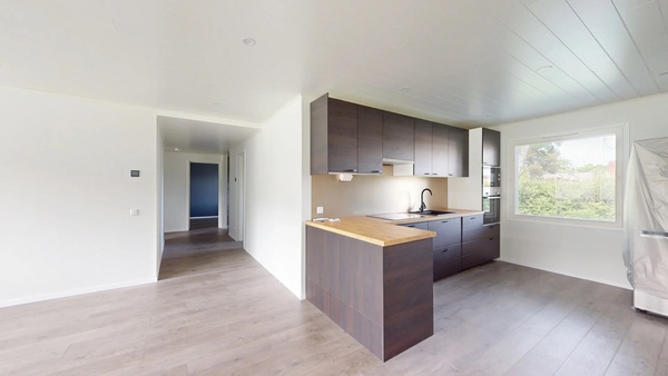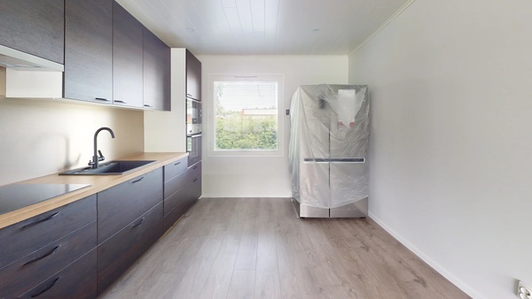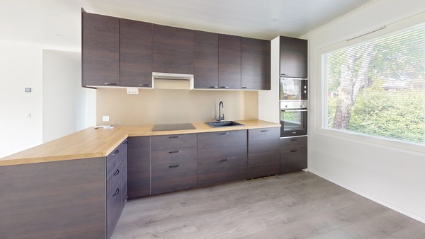 Keittiö ja olohuone ovat yhtenäistä tilaa.