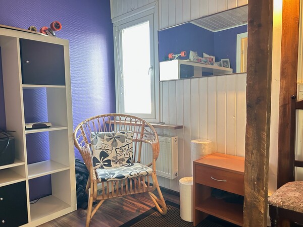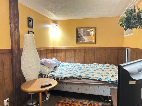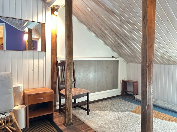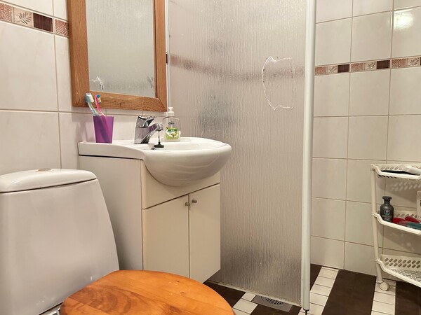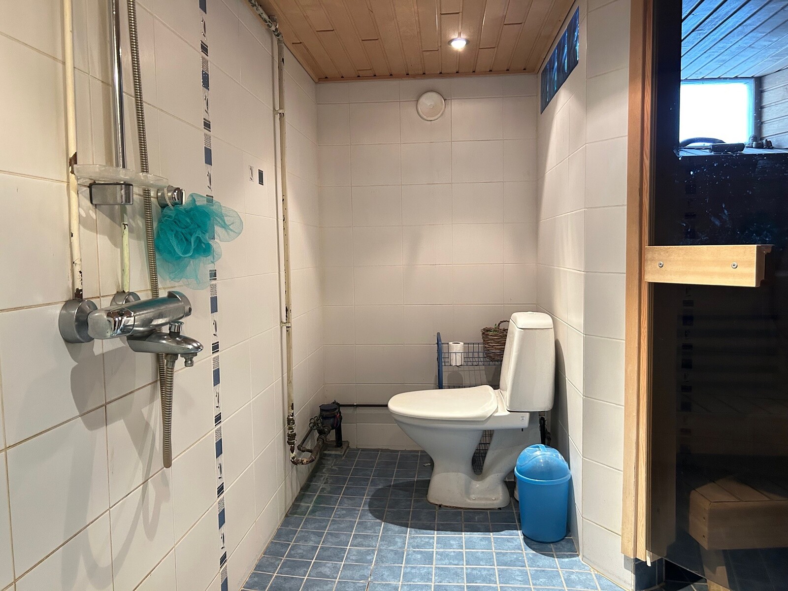 Alhaalla on pesutilat (pesuhuoneessa wc-istuin!), pyykkihuolto, pannuhuone, verstastilaa ja oleskelutila, jota voi pitää vaikka huoneena.
