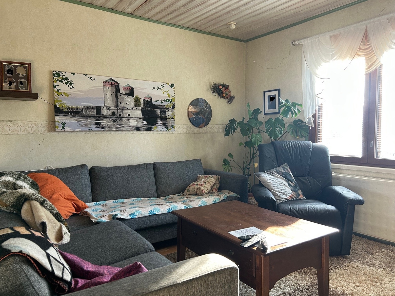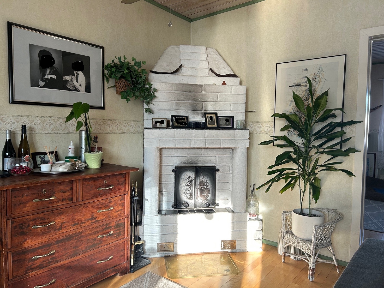 Öljykeskuslämmitys ja takka olohuoneessa. Vuokratontti.