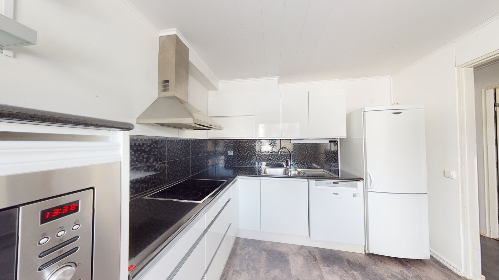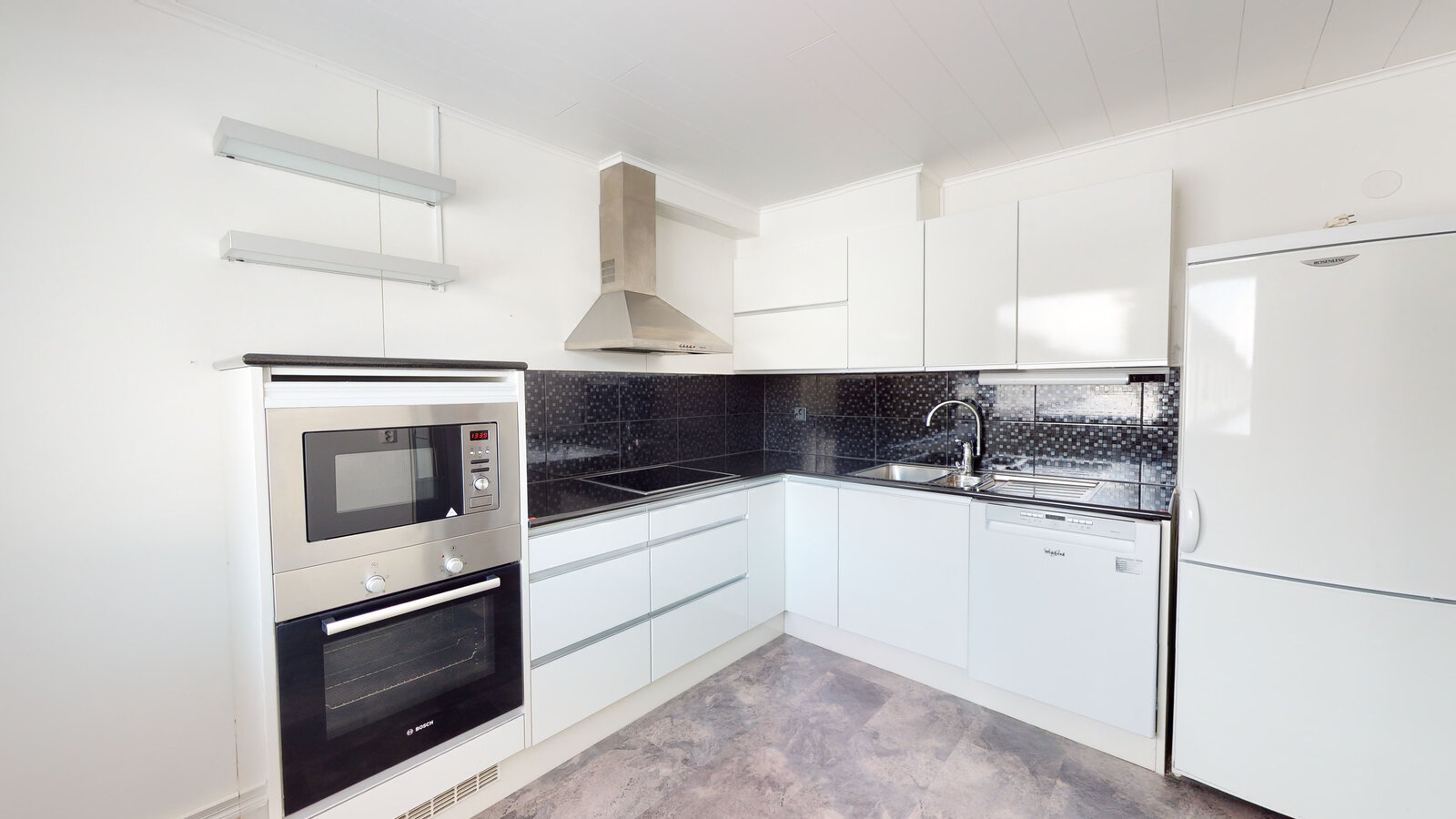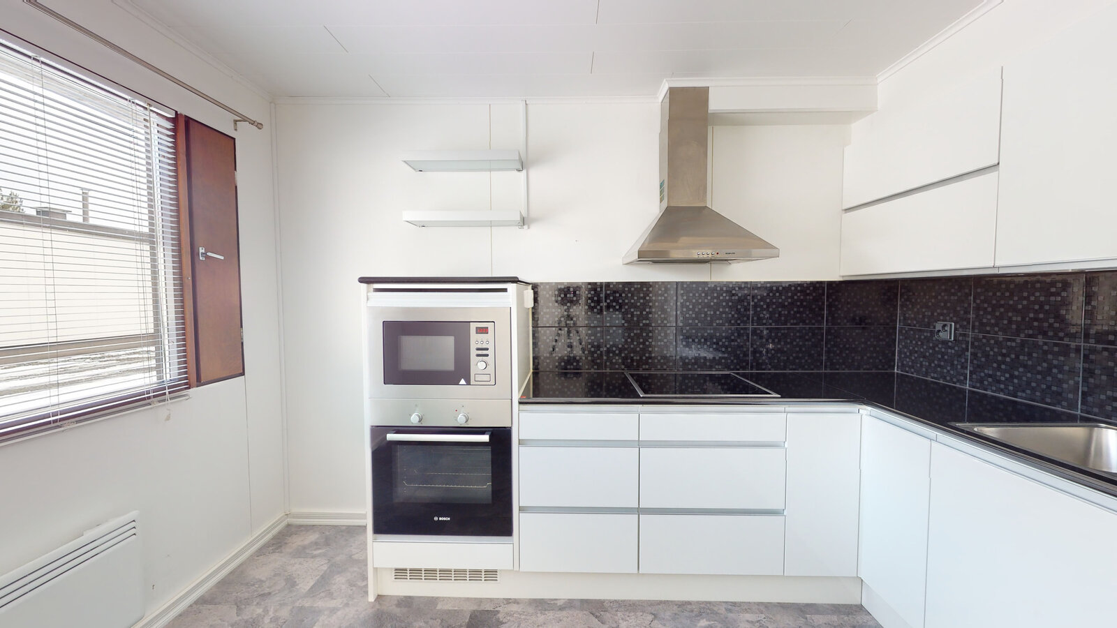 Kaunis, toimiva keittiö. On hyvin kaappitilaa ja mm. kivitasot.
