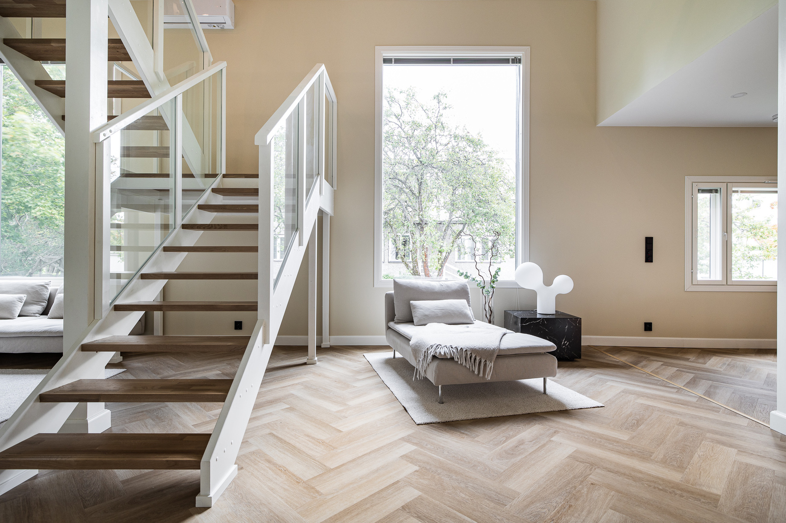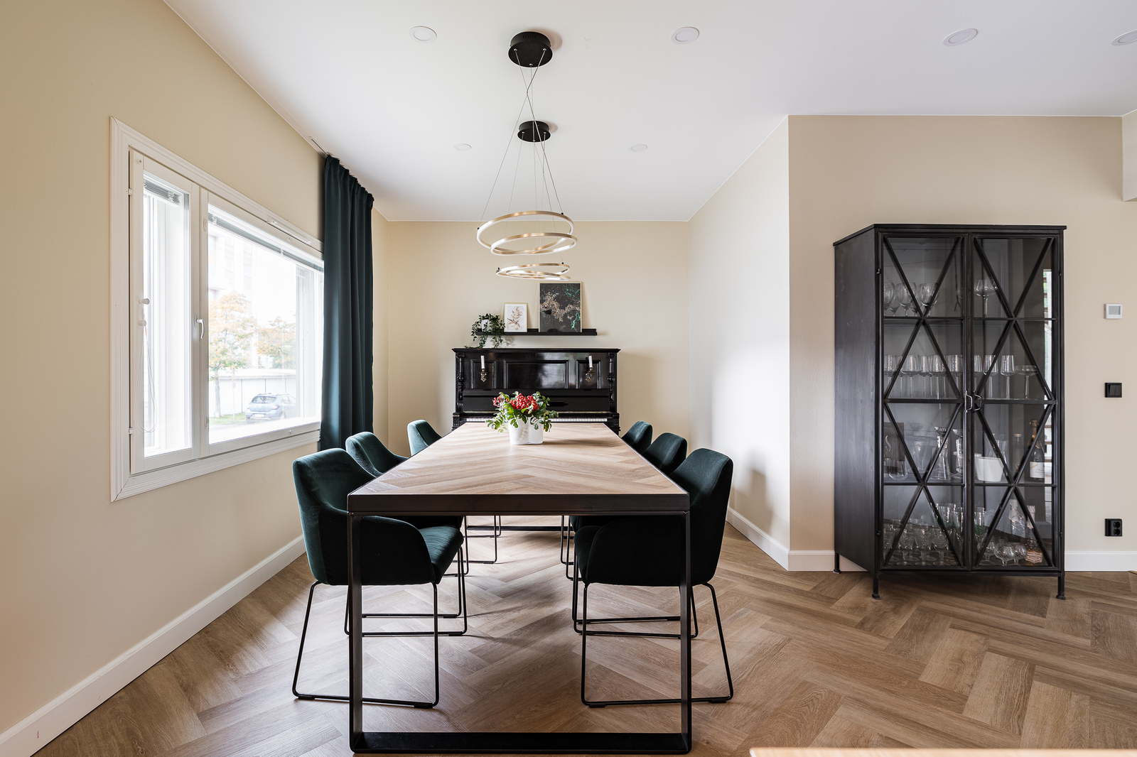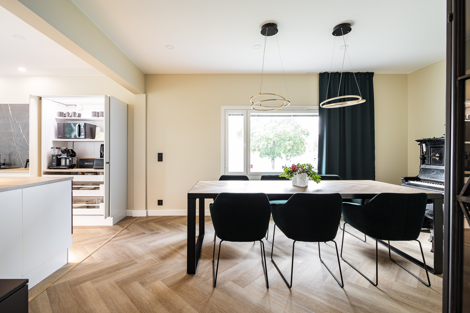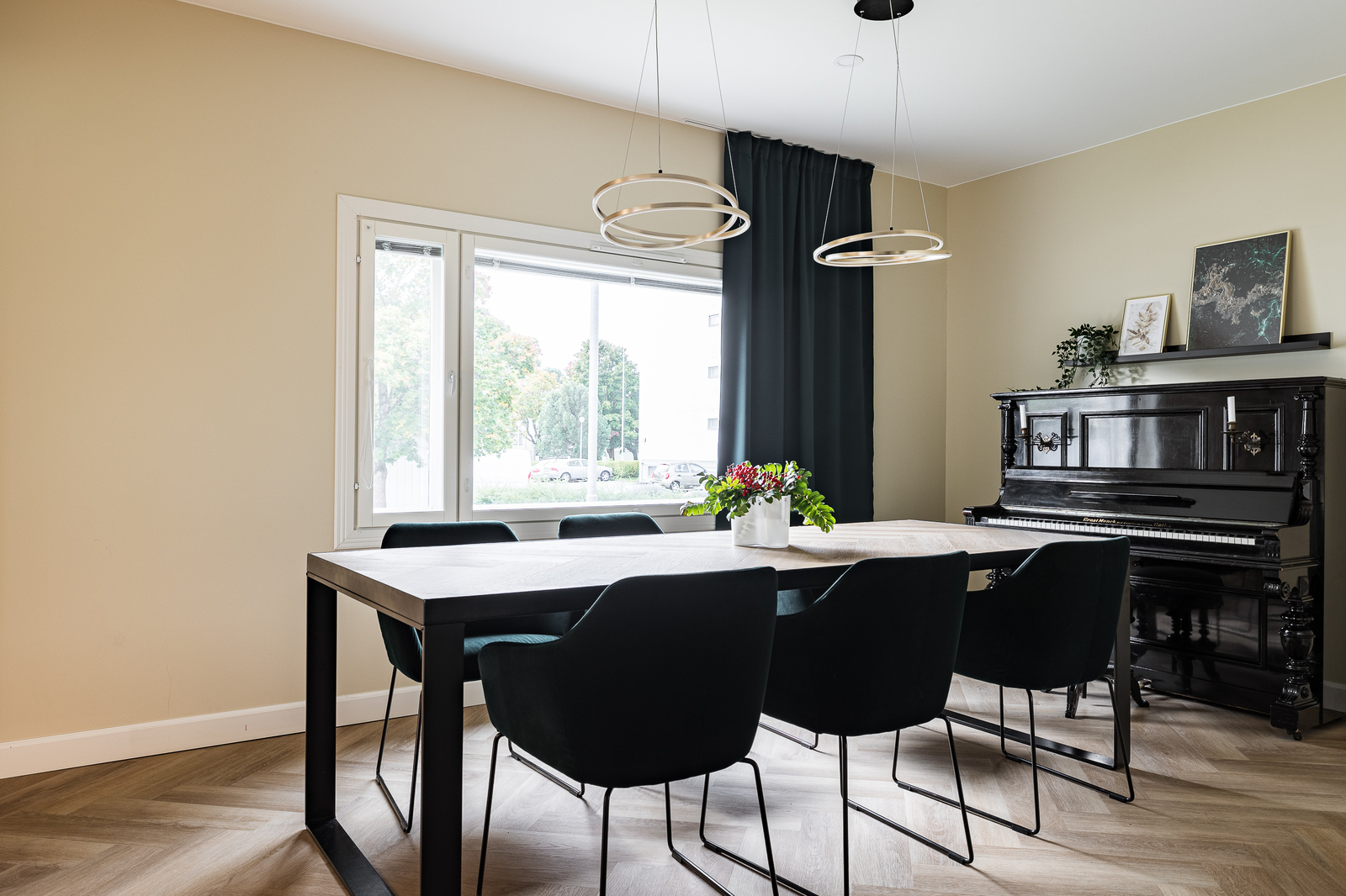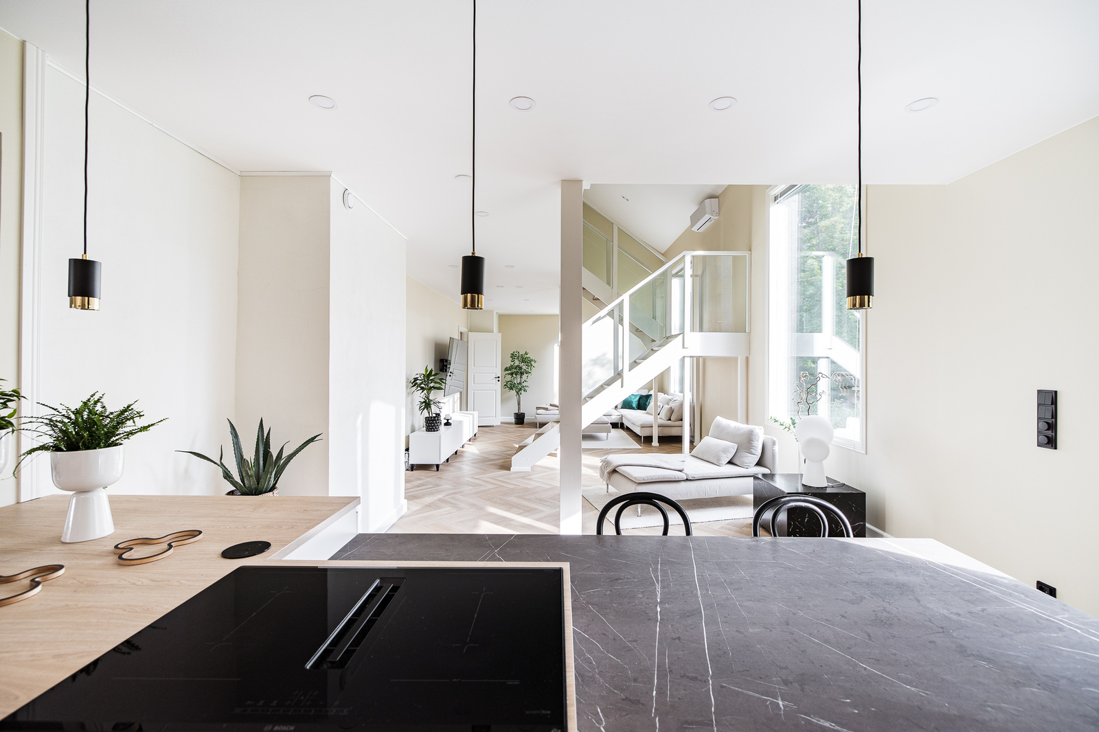 Kodin tunnelma on moderni ja valoisa. Suuret avarat tilavat sopivat mainiosti niin arjen pyörittämiseen kuin edustaviin juhlahetkiin. Sijainti Käppärässä on erinomainen: koulujen, palveluiden ja hyvien liikenneyhteyksien päässä, mutta silti rauhallisella alueella.