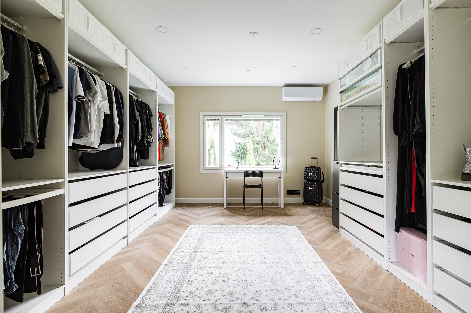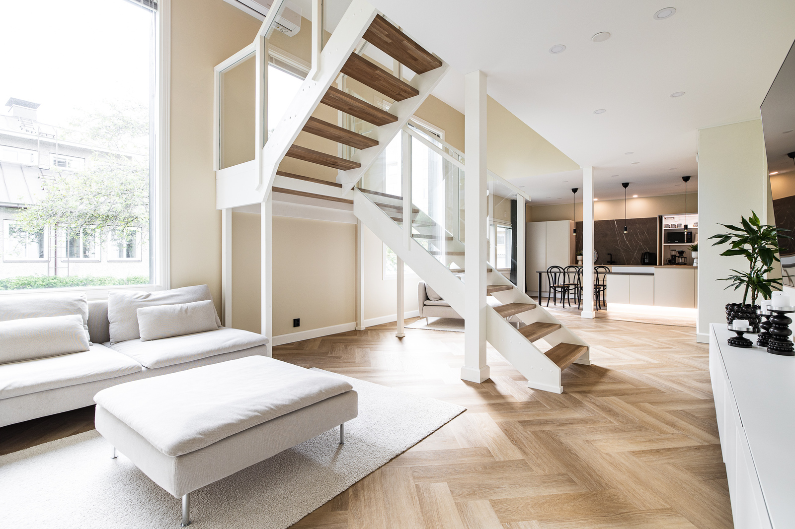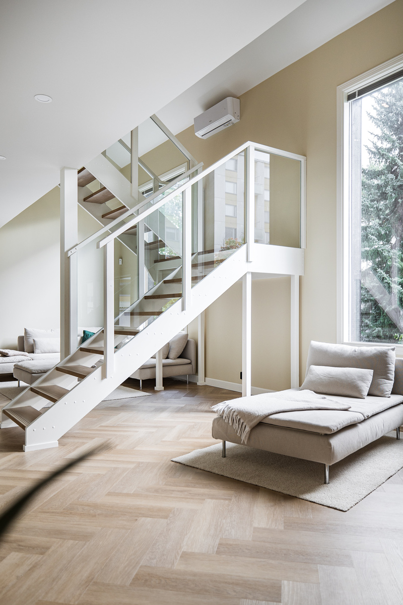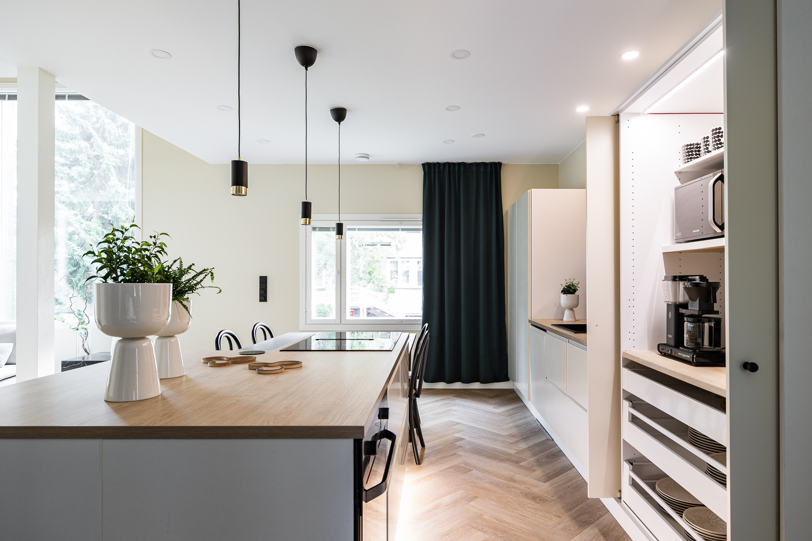Kodin tunnelma on moderni ja valoisa. Suuret avarat tilavat sopivat mainiosti niin arjen pyörittämiseen kuin edustaviin juhlahetkiin. Sijainti Käppärässä on erinomainen: koulujen, palveluiden ja hyvien liikenneyhteyksien päässä, mutta silti rauhallisella alueella.
