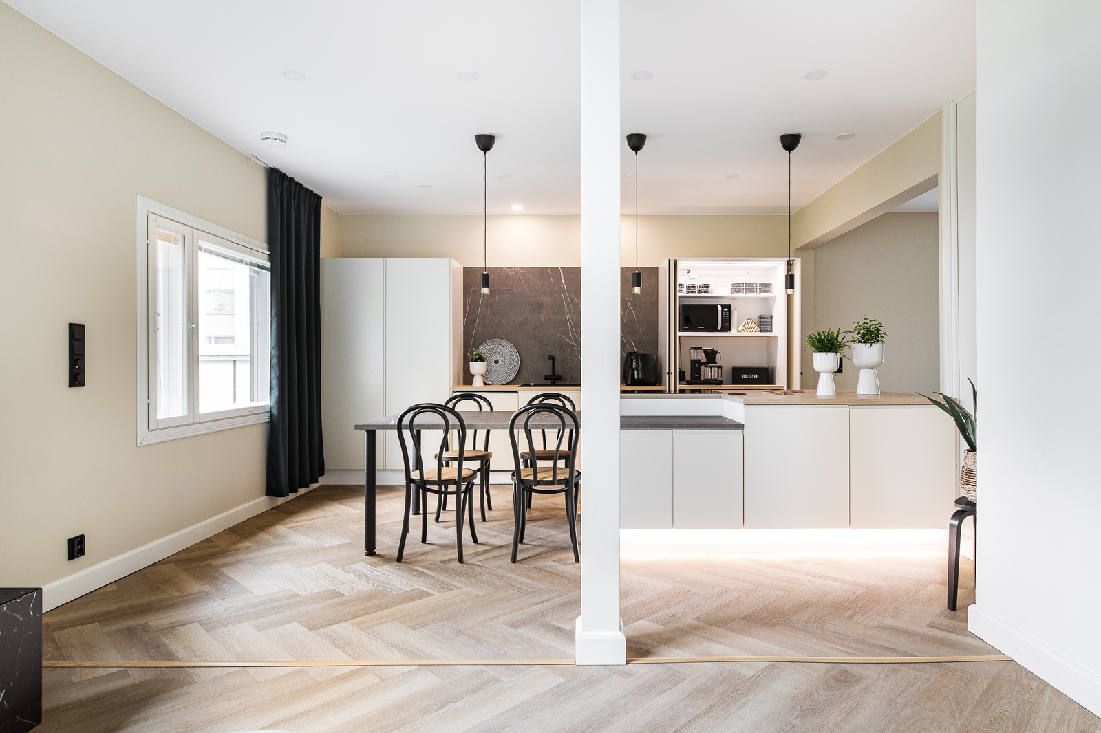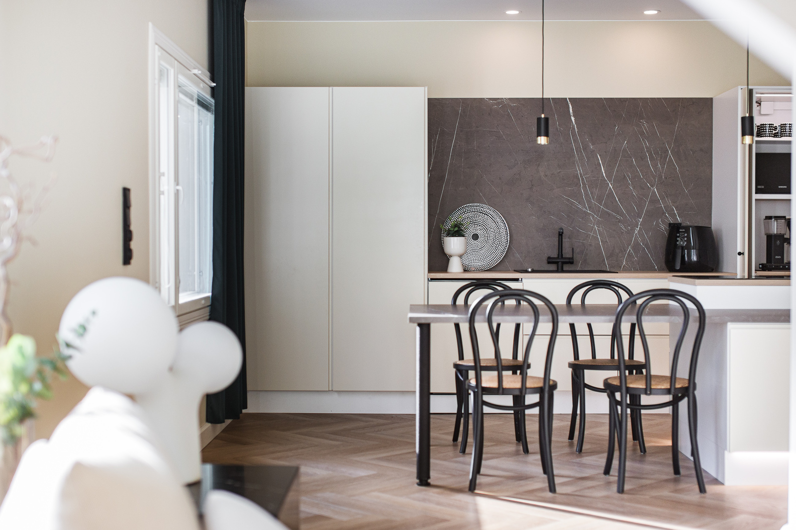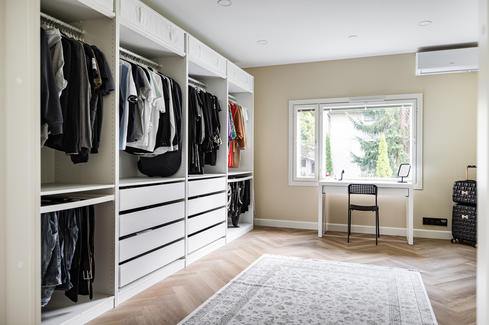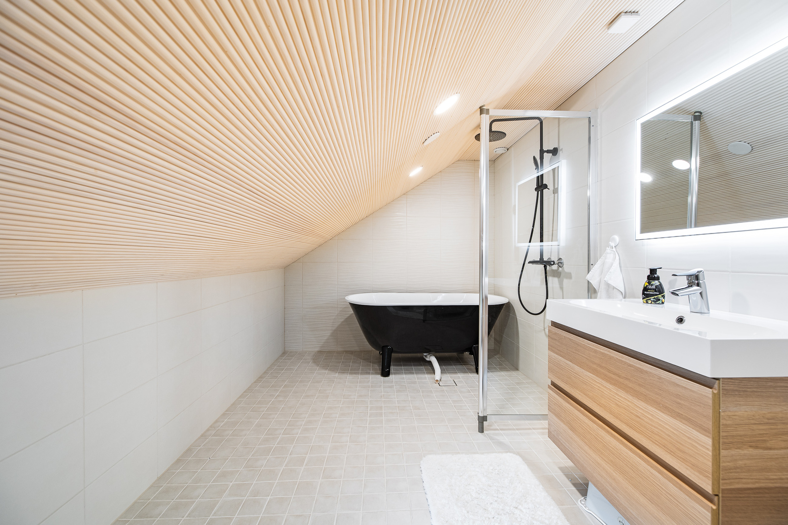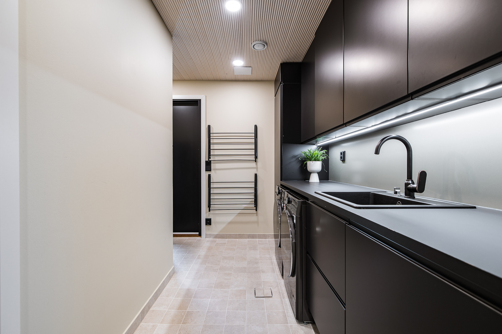 Kodin tunnelma on moderni ja valoisa. Suuret avarat tilavat sopivat mainiosti niin arjen pyörittämiseen kuin edustaviin juhlahetkiin. Sijainti Käppärässä on erinomainen: koulujen, palveluiden ja hyvien liikenneyhteyksien päässä, mutta silti rauhallisella alueella.