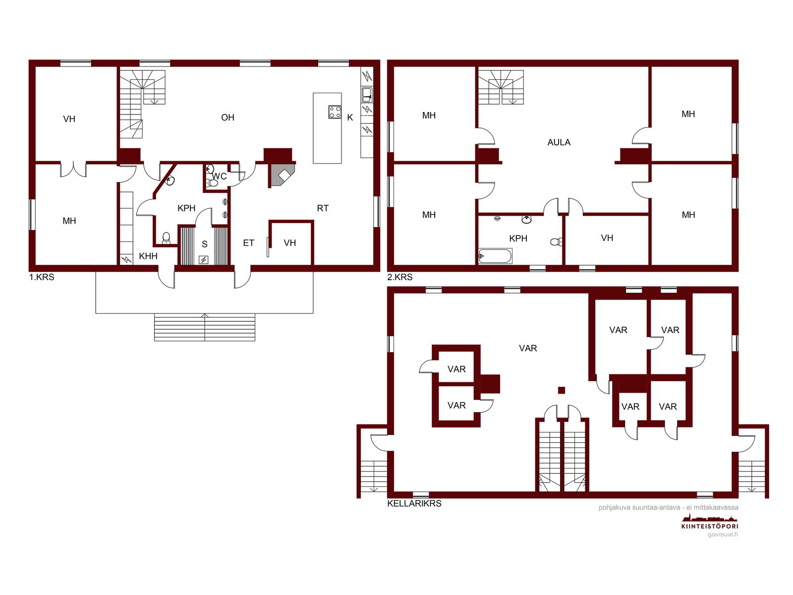 | Lisätietoja pinta-alasta | Huoneistoala 258,5m2 ja kerrosala 290m2. Lisäksi kellarikerroksessa viileä säilytystilaa n. 150m2 |