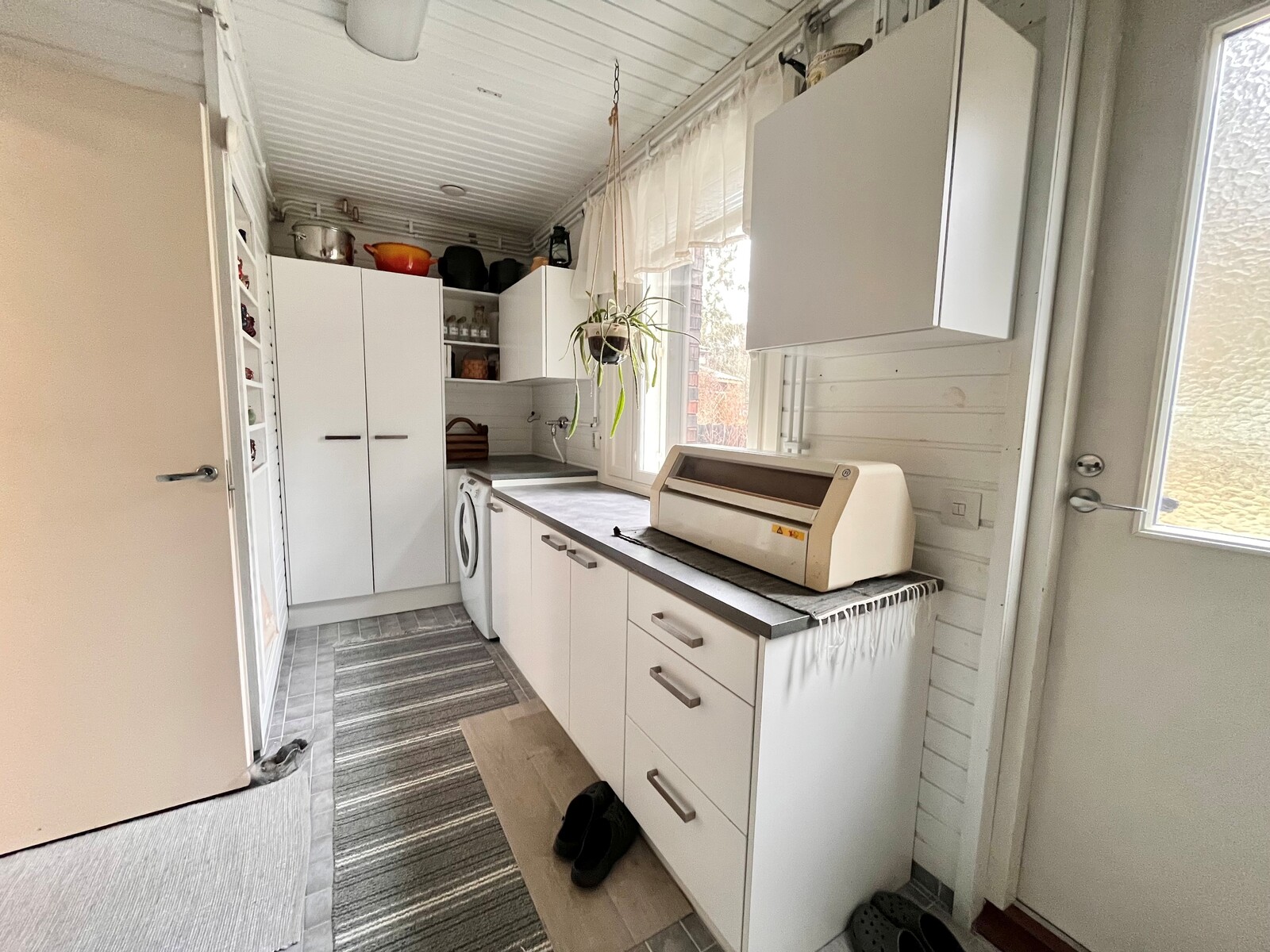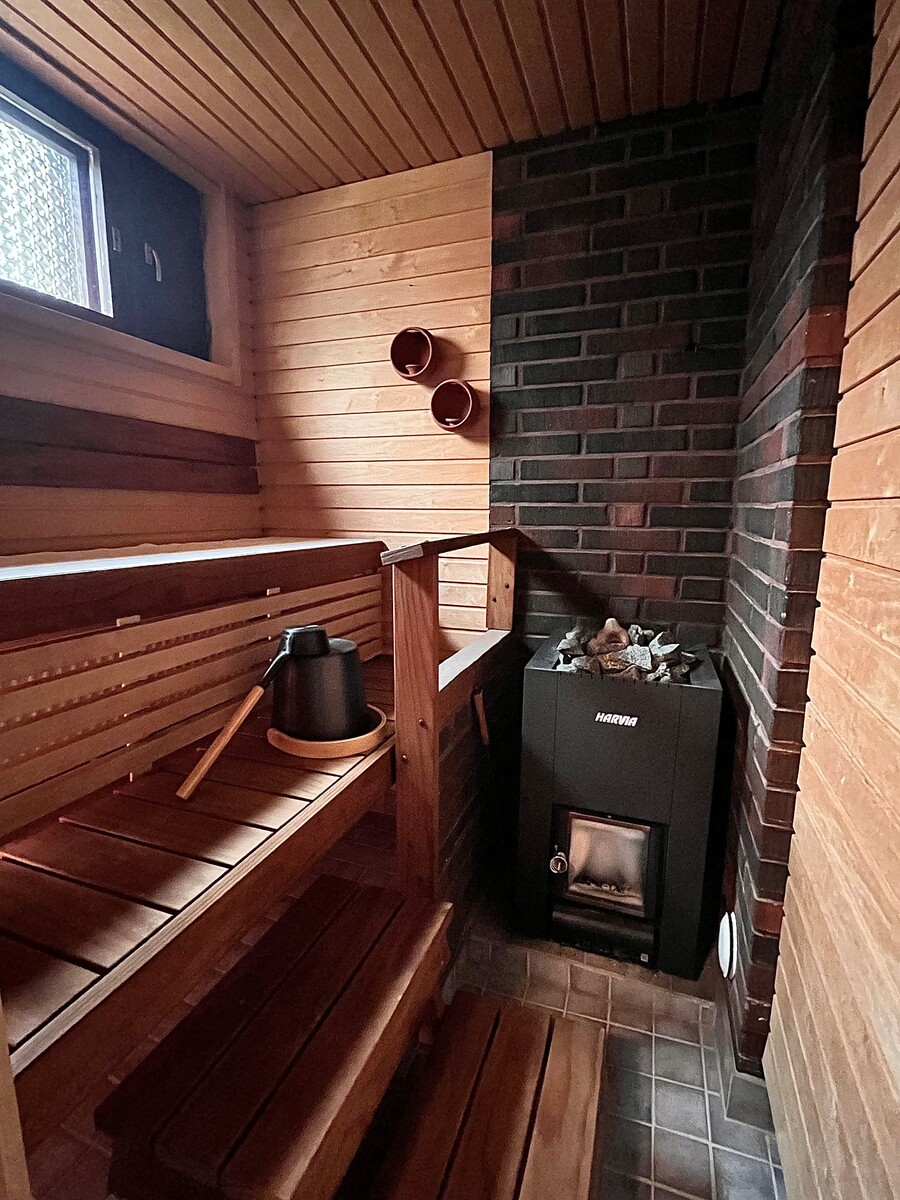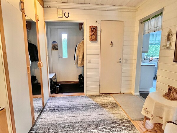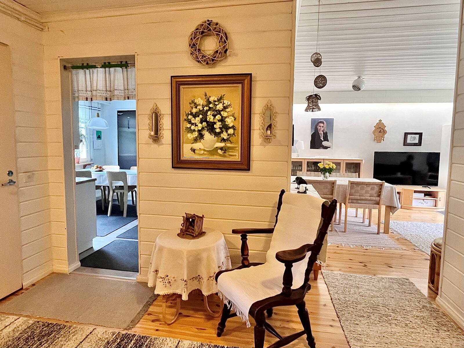 Tämän kodin tilat jakautuvat käytännöllisesti yhteen tasoon. Asunnossa on kolme makuuhuonetta, tilava keittiö sekä valoisa olohuone, jossa suuret ikkunat ja tunnelmallinen takka. Lisäksi löytyy vaatehuone, erillinen wc sekä kodinhoitohuone, josta on käynti niin pihaan kuin saunaosastolle. Sauna lämpiää perinteisesti puulla.