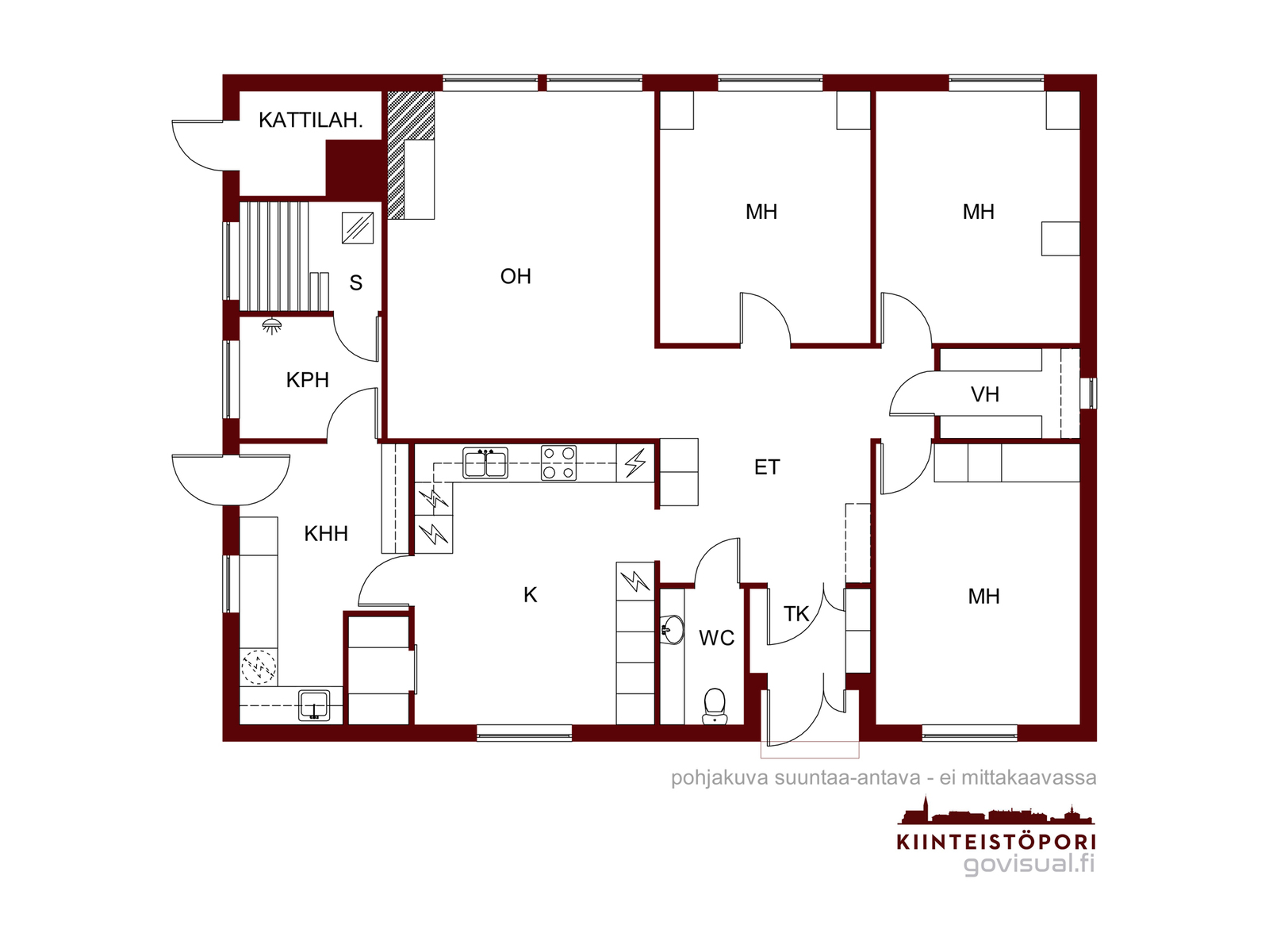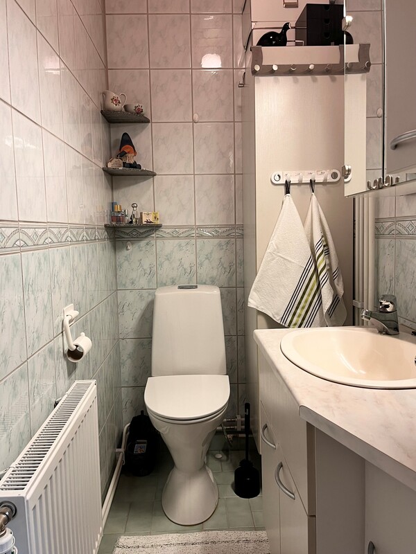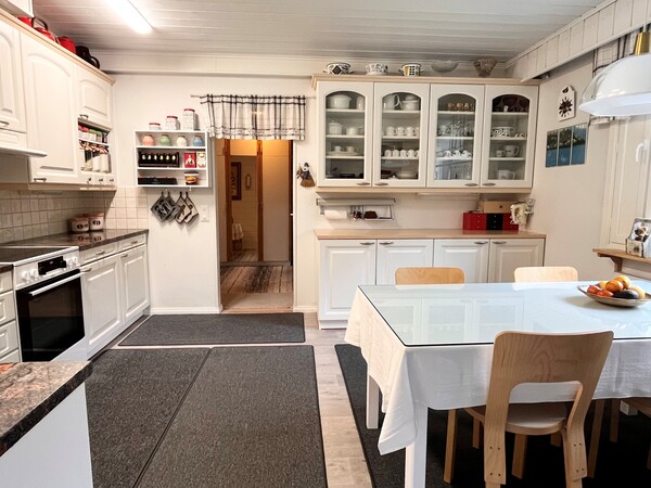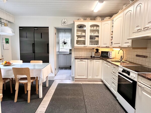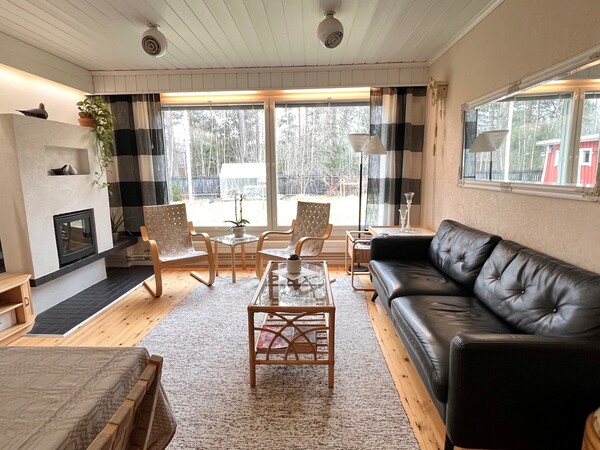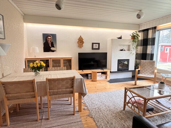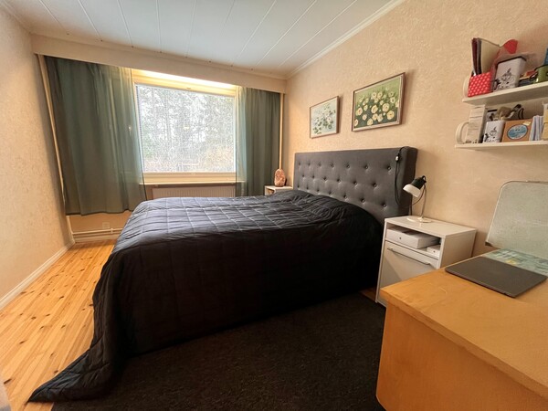 Tämän kodin tilat jakautuvat käytännöllisesti yhteen tasoon. Asunnossa on kolme makuuhuonetta, tilava keittiö sekä valoisa olohuone, jossa suuret ikkunat ja tunnelmallinen takka. Lisäksi löytyy vaatehuone, erillinen wc sekä kodinhoitohuone, josta on käynti niin pihaan kuin saunaosastolle. Sauna lämpiää perinteisesti puulla.