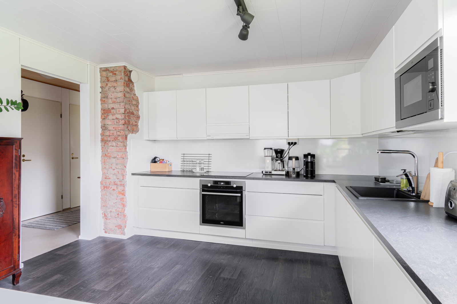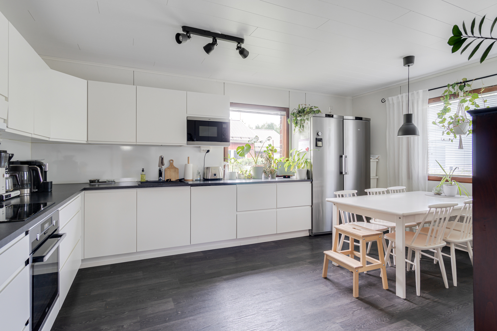 Tässä kodissa on todella tilava v. 2019 remontoitu keittiö kodinkoneineen, paljon kaappitilaa ja työtasoa ja sinne mahtuu vaikka 8 hengen ruokailuryhmä.