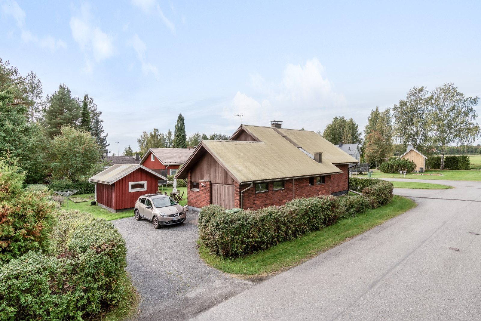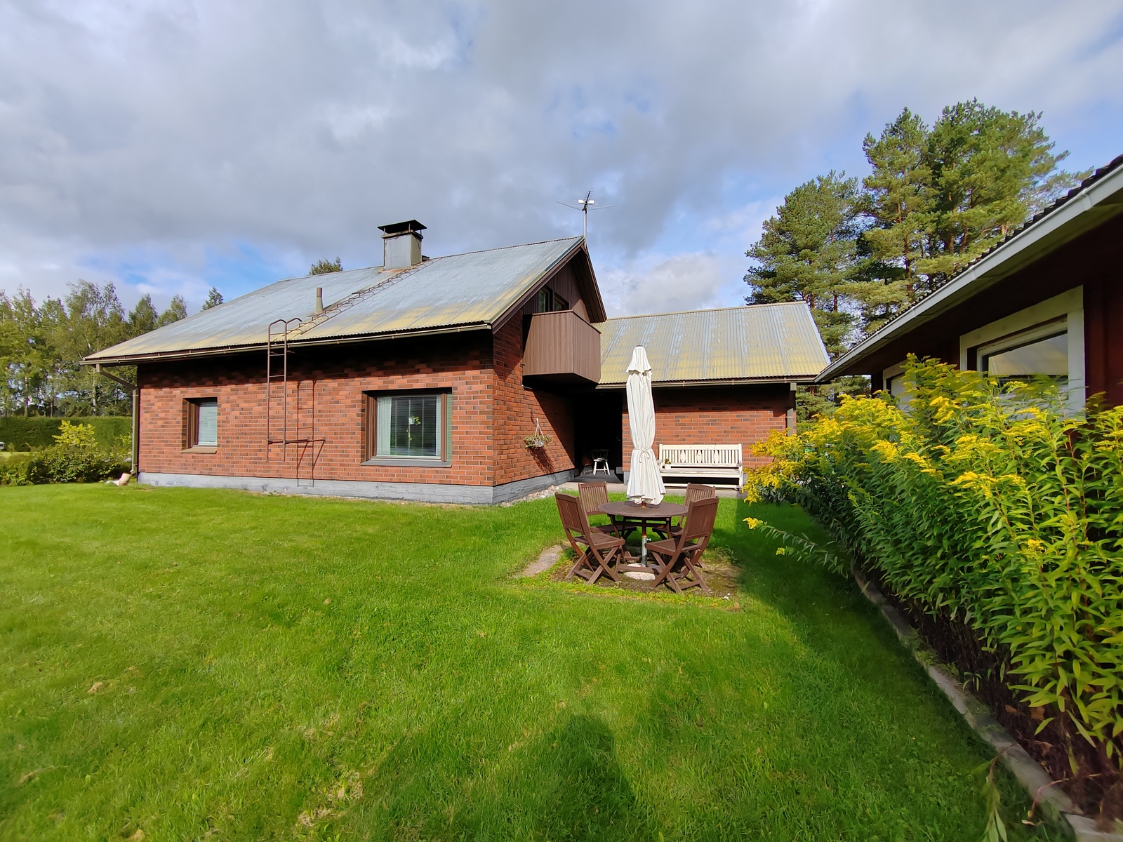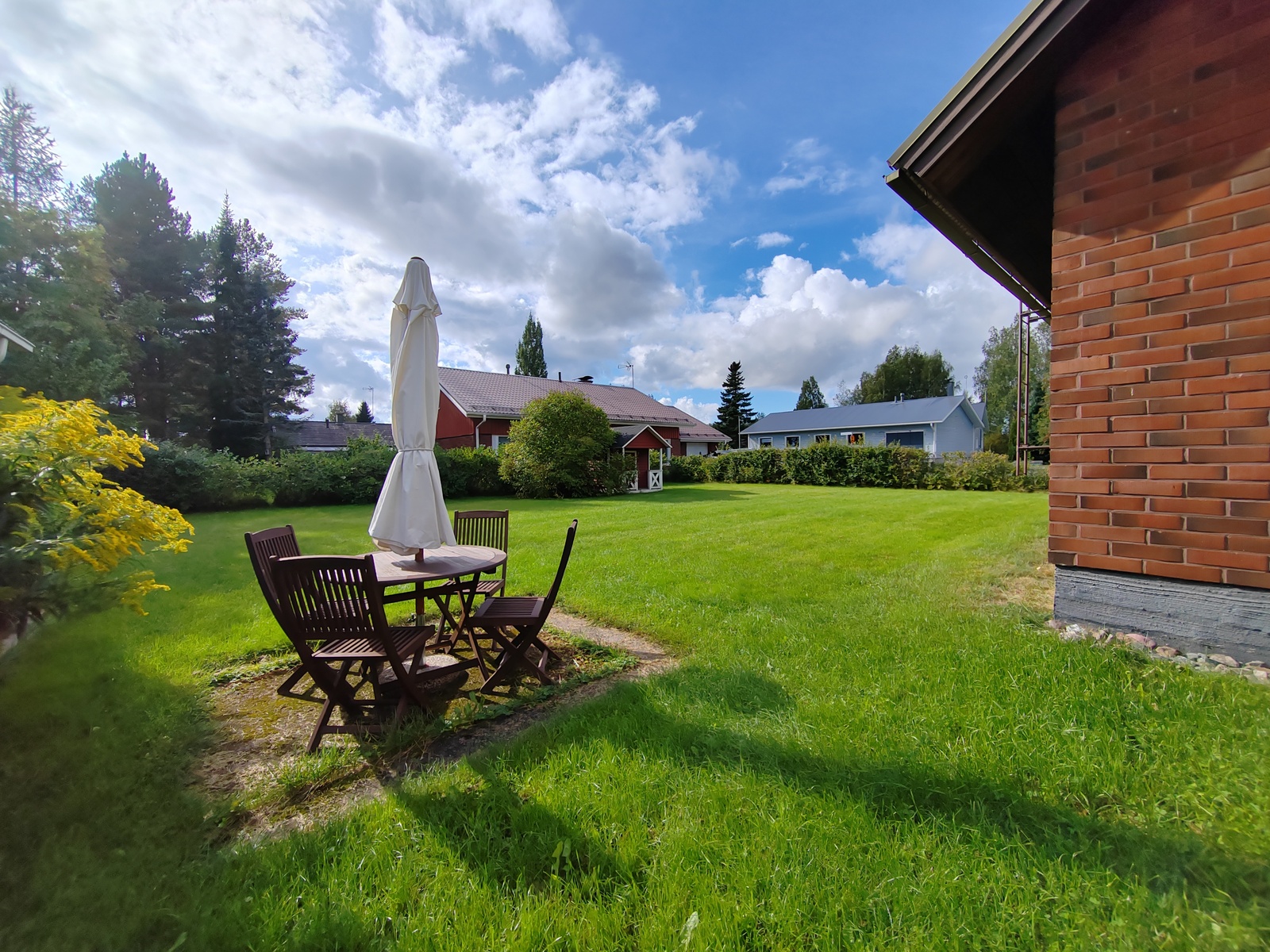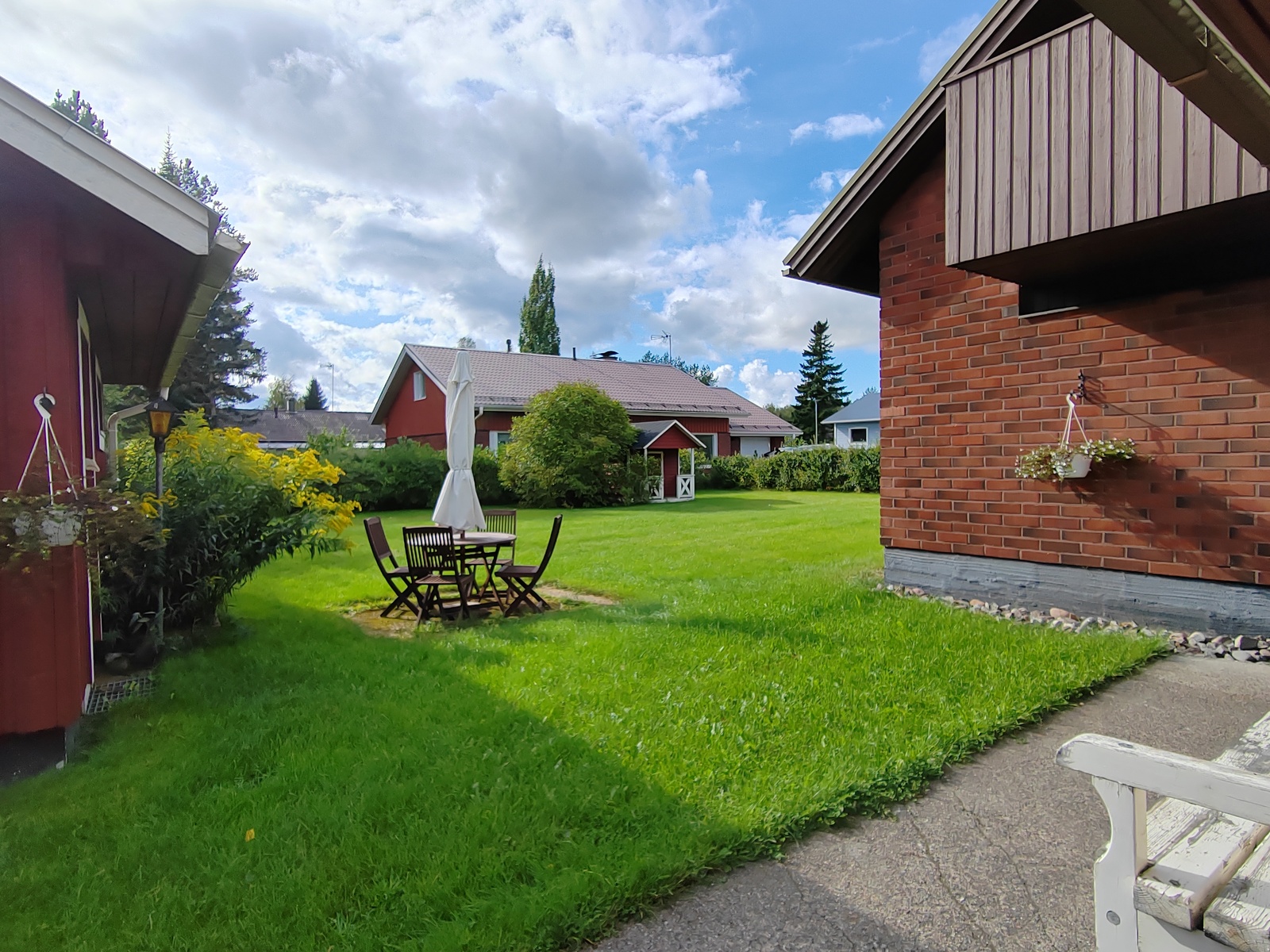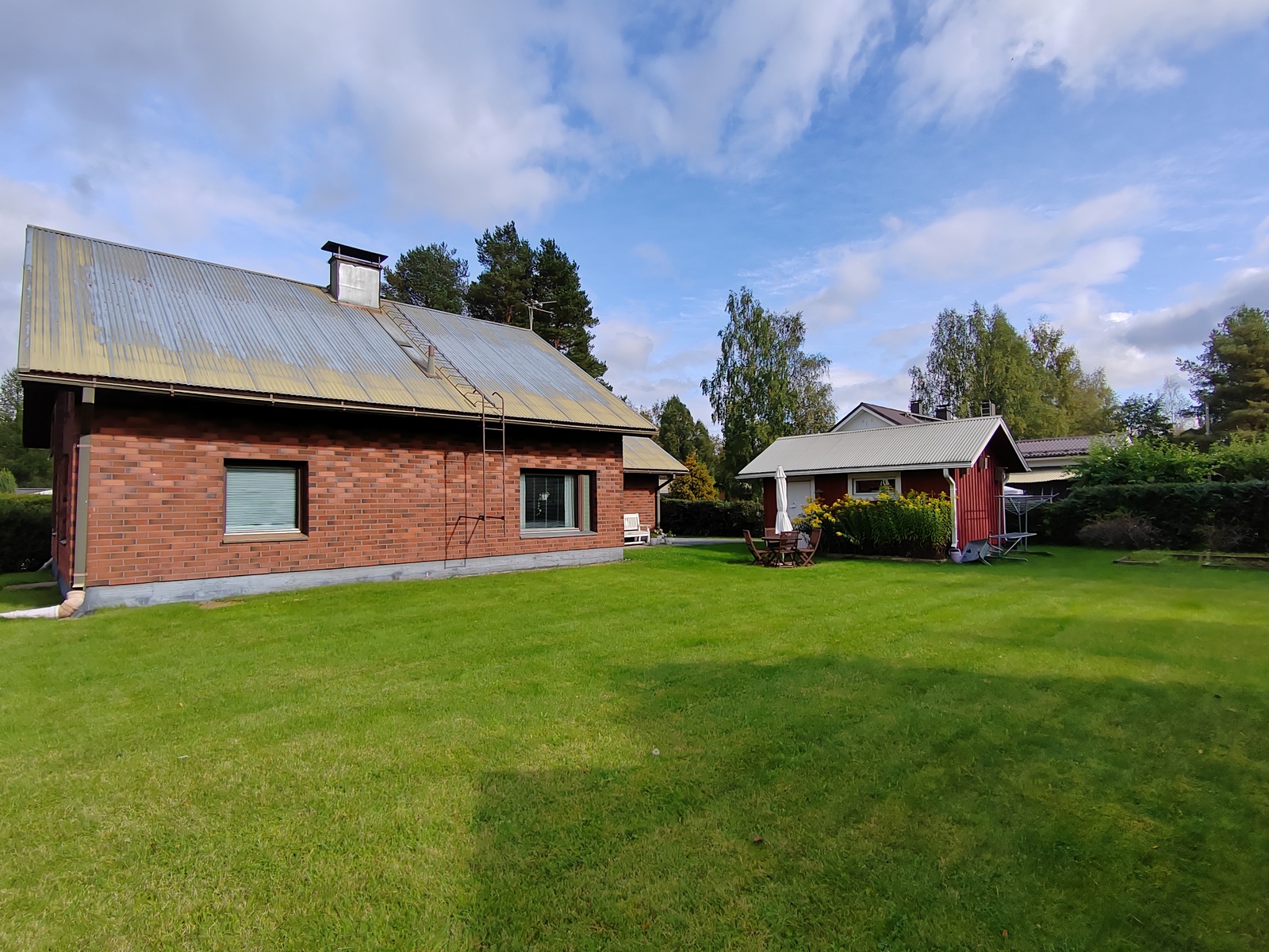 Oleskelupiha aurinkoiseen eteläsuuntaan, pihassa lisäksi erillinen varastorakennus sekä leikkimökki.