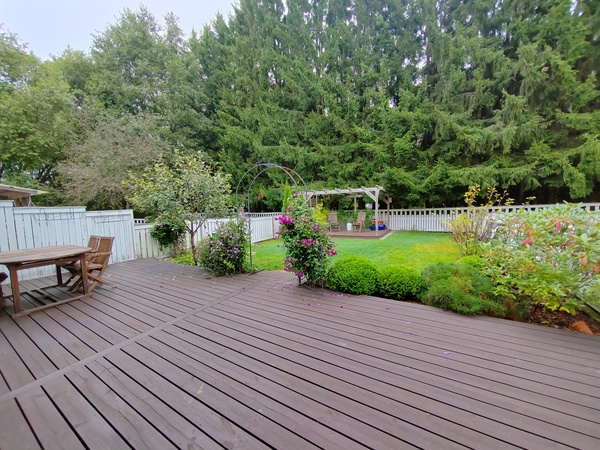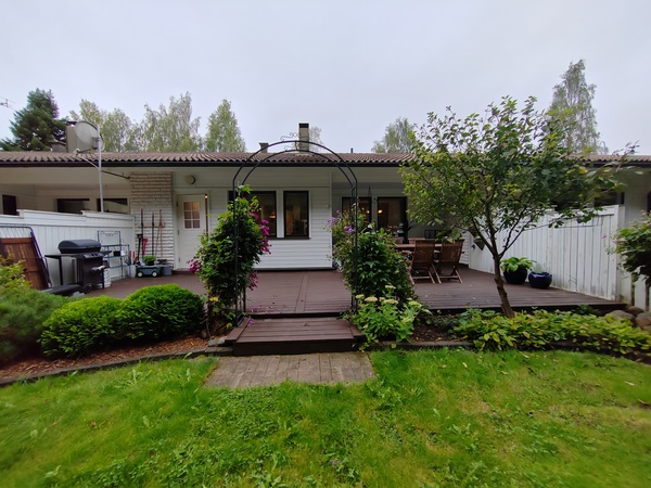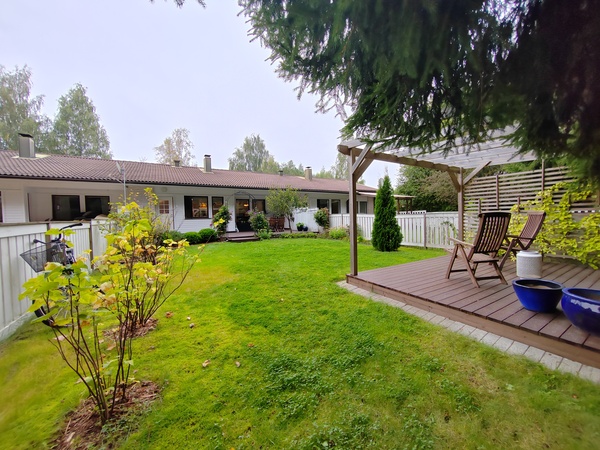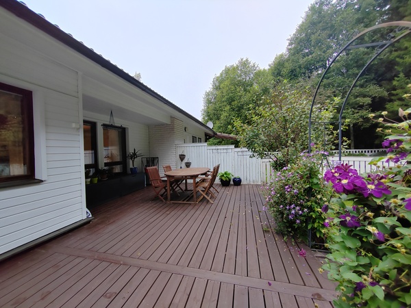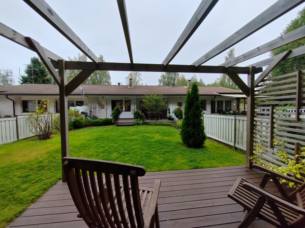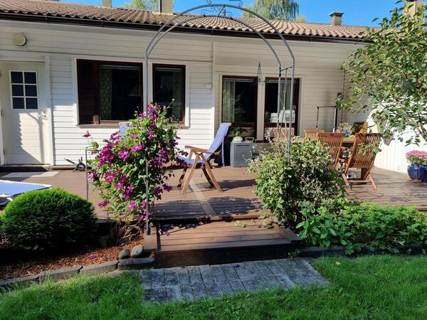 Takapiha on erittäin suojaisa isolla terassilla, lisäksi erillinen pergola, jossa voit vaikkapa ihastella ilta-aurinkoa.