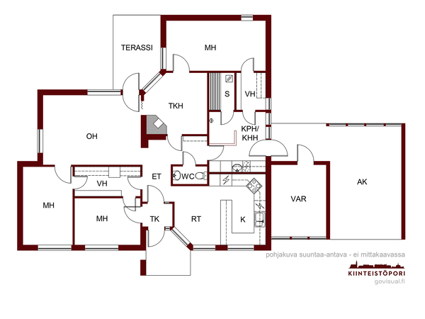 | Lisätietoja pinta-alasta | Huoneistoala 115m2 ja kerrosala 168m2. Huoneistoala on arvioitu ja saattaa poiketa ilmoitetusta suuntaan tai toiseen. Todellisen pinta-alan saa ainoastaan paikan päällä mittaamalla |