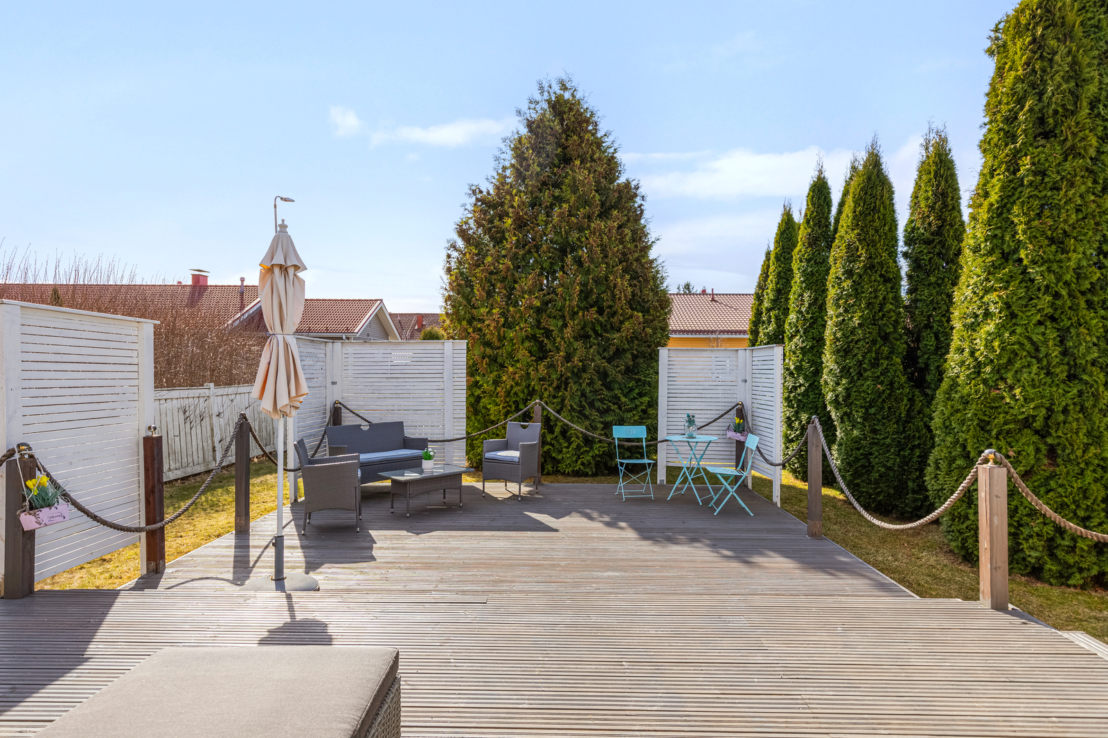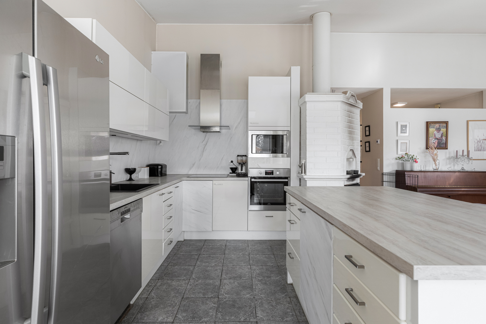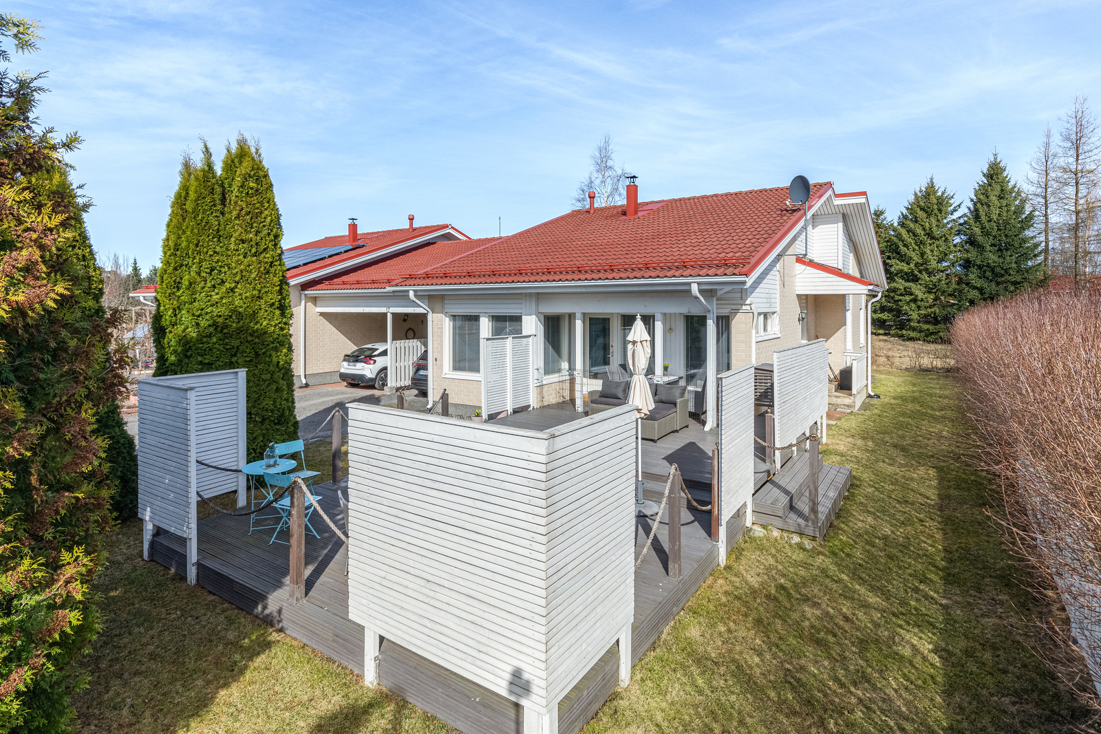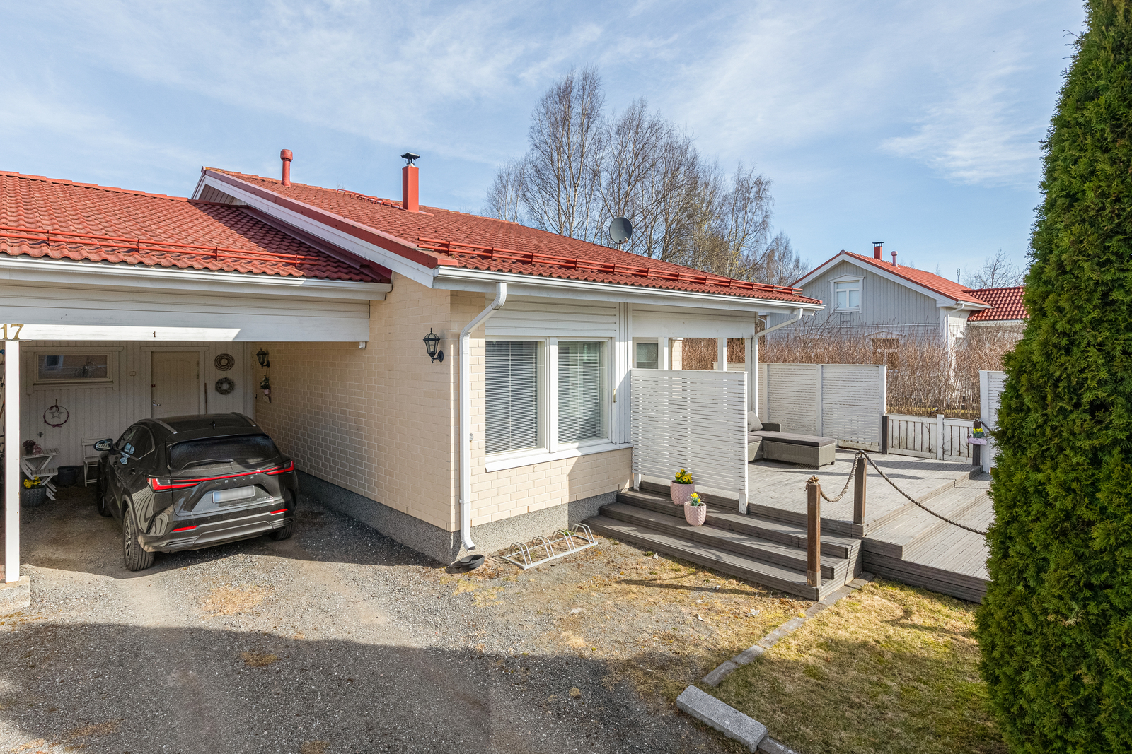 Arjen sujuvuutta tukevat erillinen wc, kodinhoitohuone ja vaatehuone, jotka tarjoavat runsaasti mm. säilytystilaa. Suuri terassi toimii loistavana lisätilana kesäisin – täydellinen paikka rentoutumiseen ja oleskeluun. Lisäksi käytössäsi on autokatos sekä lämmin varasto. Tontti rajautuu kaupungin puistoalueeseen.