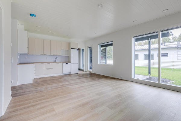 Tässä 3h,k,s kokonaisuudessa on toimiva ja avara pohjaratkaisu, jossa olohuone ja keittiö yhdistyvät moderniksi ja valoisaksi oleskelutilaksi. Suuret ikkunat tuovat sisään hyvin luonnonvaloa.