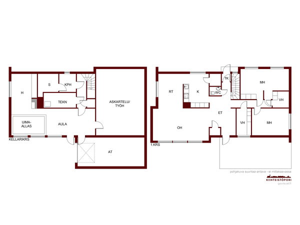 | Huoneiston kuvaus | Alakerrassa: Askarteluhuone,autotalli,aula,uima-allas,mh,sauna,kph,wc.tekn.tila. Yläkerta: oh,2-3mh,kph,wc, |