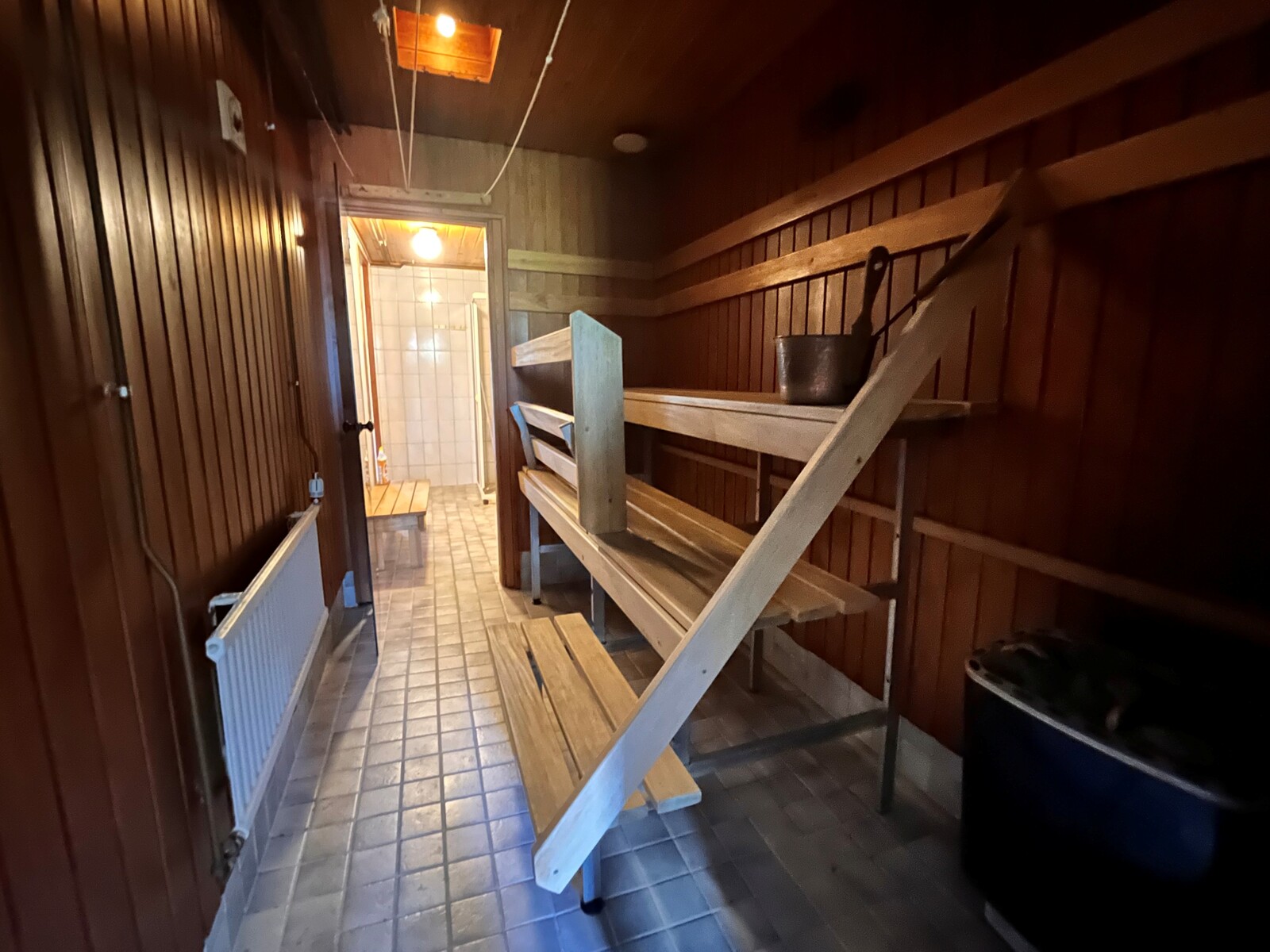 Saunan kuvaus | Lauteet ja sähkölämmitteinen kiuas. Lattia laattaa, seinissä paneelia |