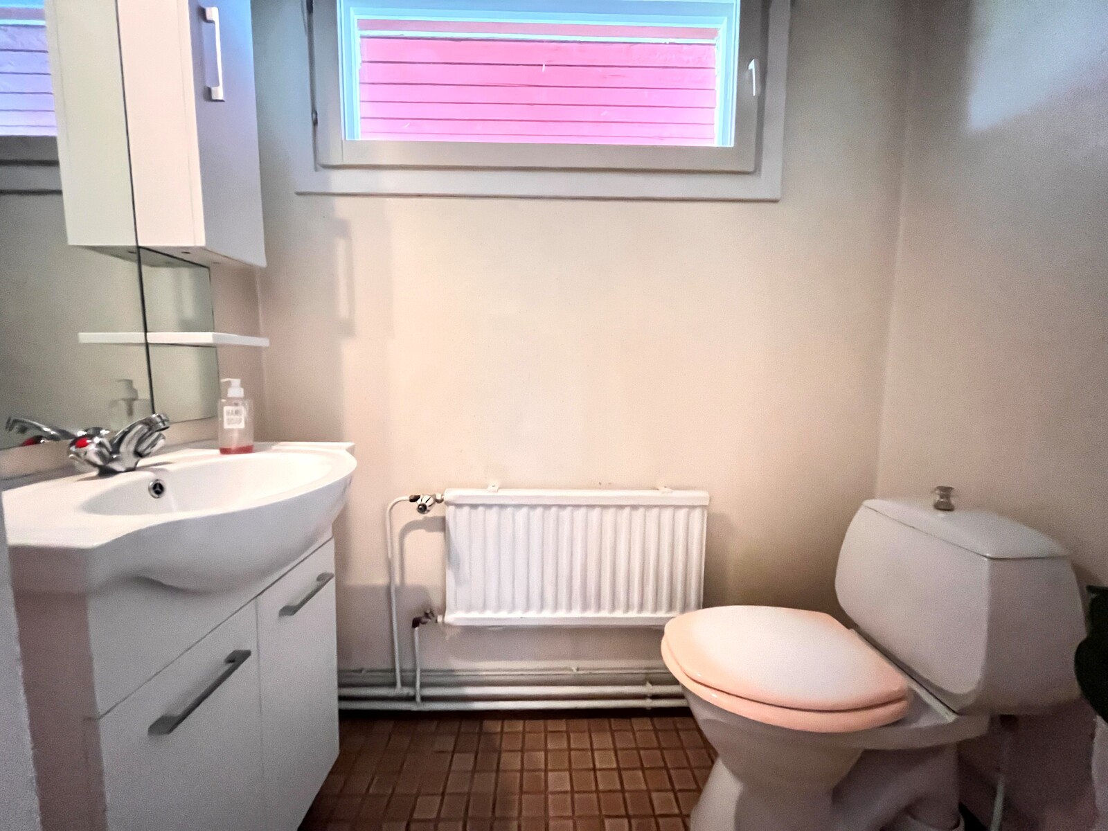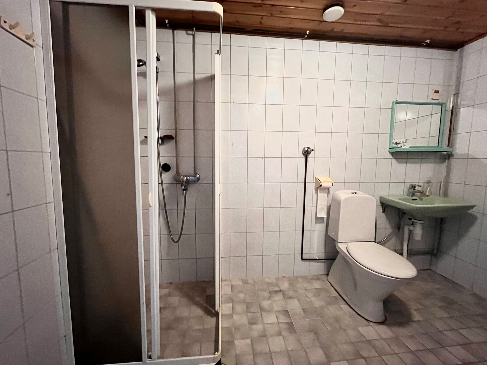 Kylpyhuoneen kuvaus | Erillinen wc: wc-istuin, lavuaari, kaapistoa. Pesuhuoneessa myös wc-istuin ja lavuaari. |