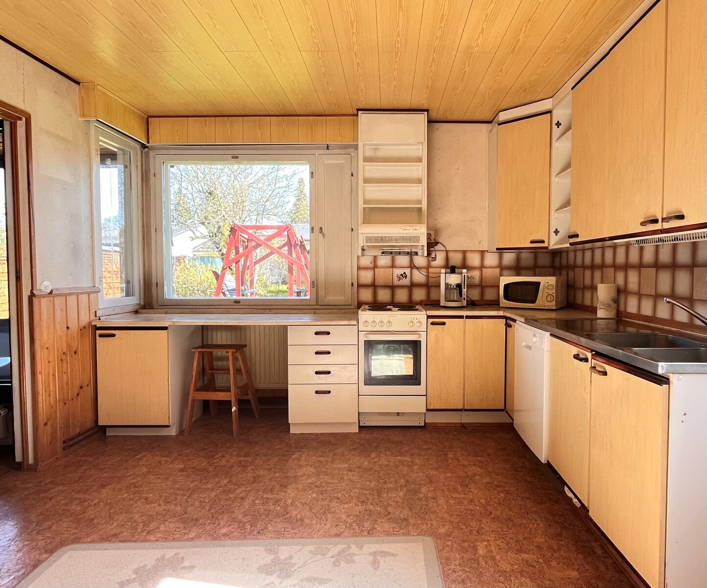 Keittiön kuvaus | Kaapistot (1991), korkea jääkaappi, korkea pakastinkaappi, keraaminen liesi, liesituuletin (hormiin), mikroaaltouuni, astianpesukone |