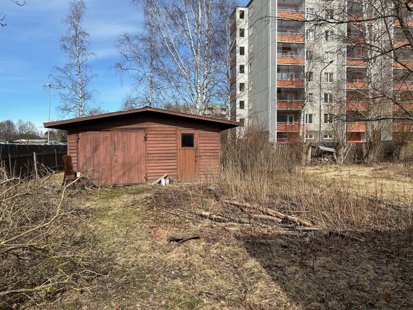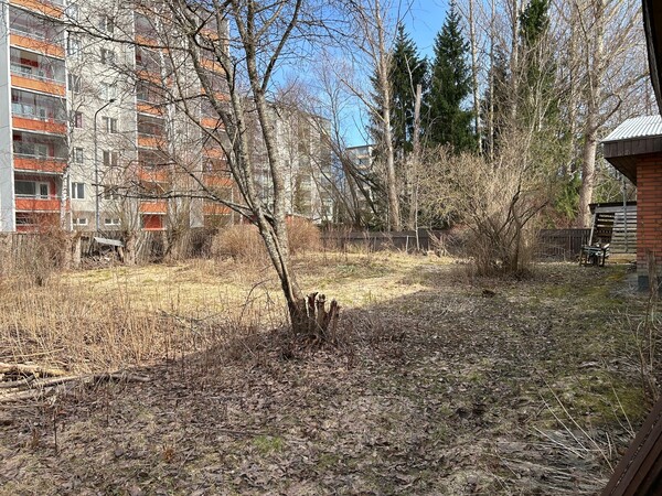 Piha on jaettu niin, että molemmille puoliskoille jää "omat pihapiirit". Tämän myytävän puolikkaan piha on, taloa edestäpäin katsottuna, vasemmalla.