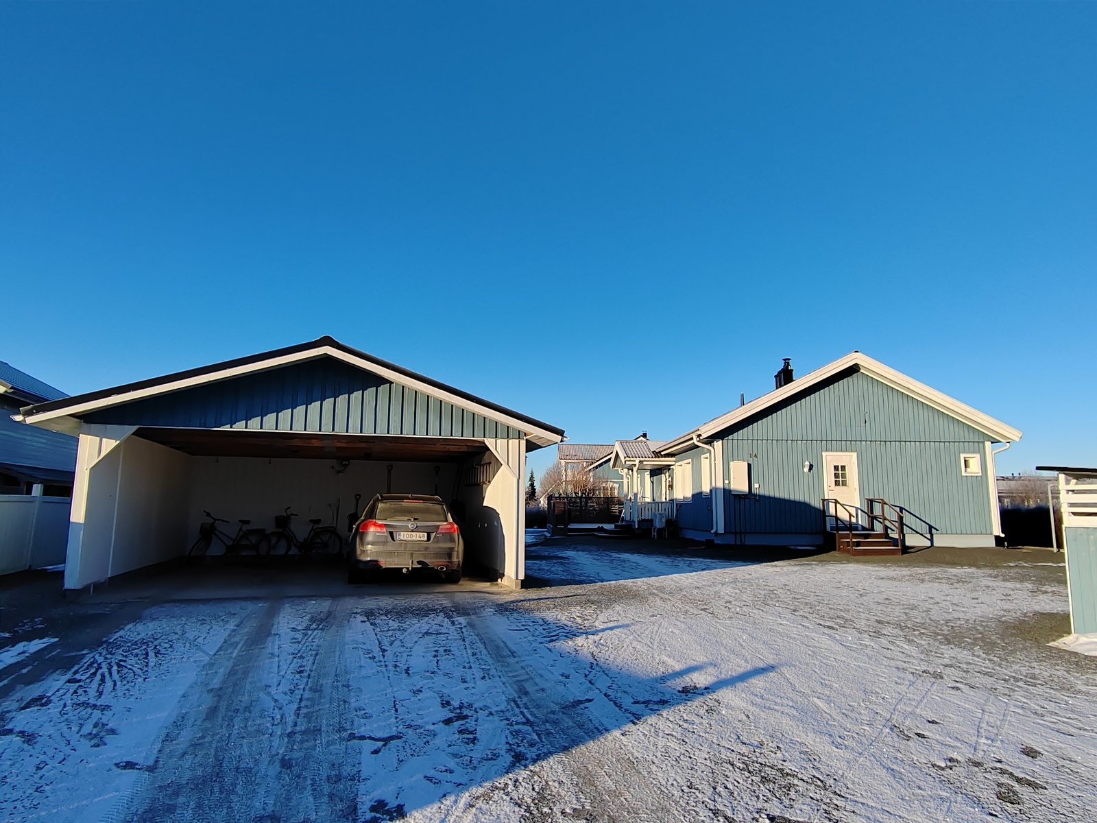Lämmitysmuotona on energiatehokas poistoilmalämpöpumppu, joka pitää asumiskustannukset maltillisena ympäri vuoden. Kahden auton katos antaa suojaa ajoneuvolle.