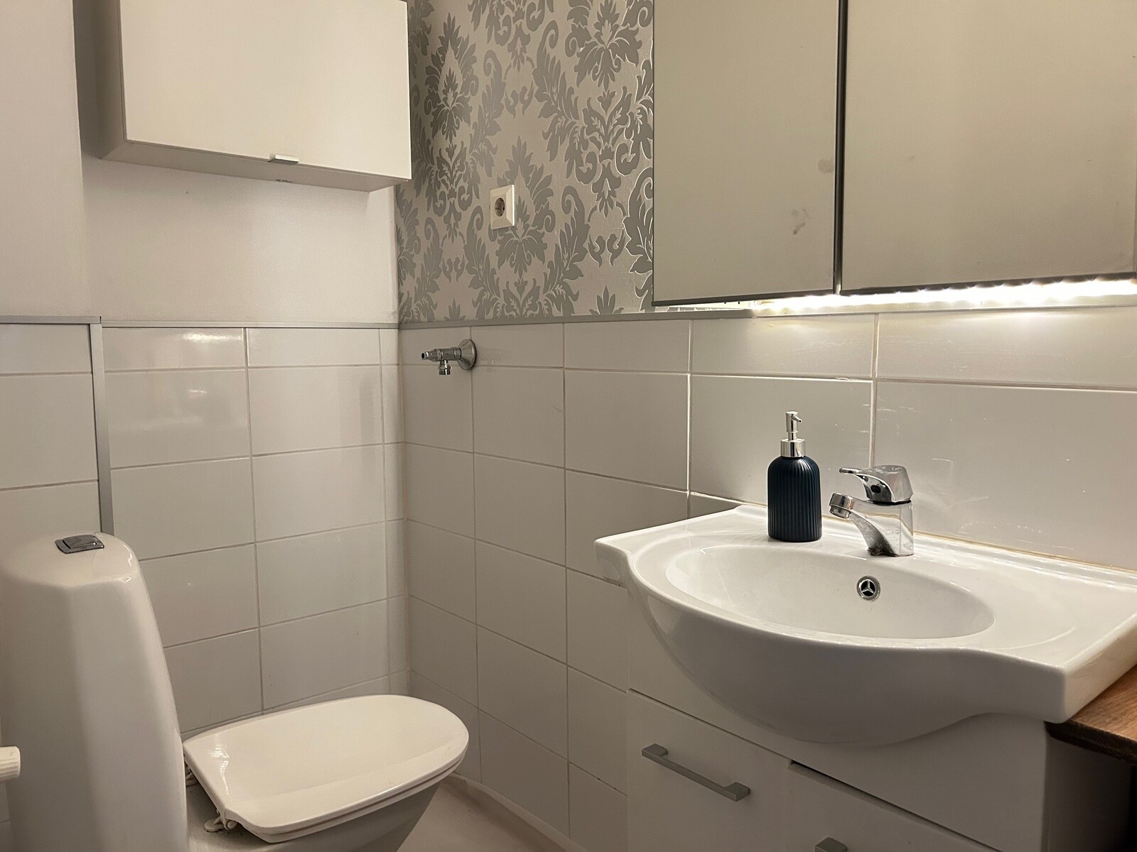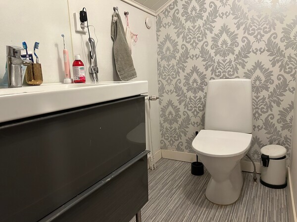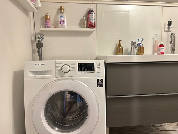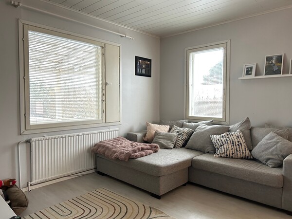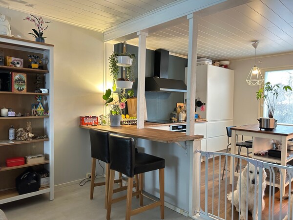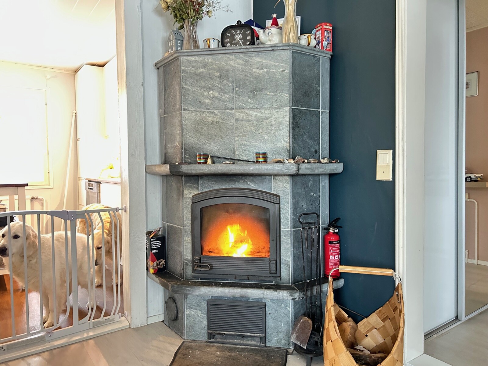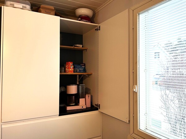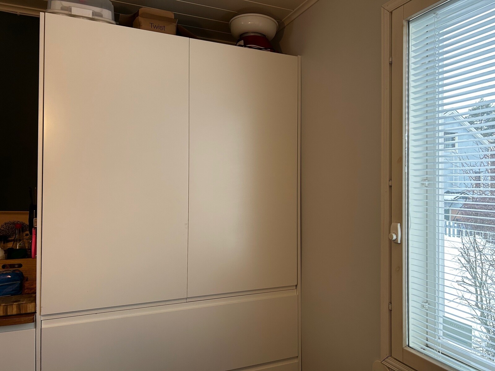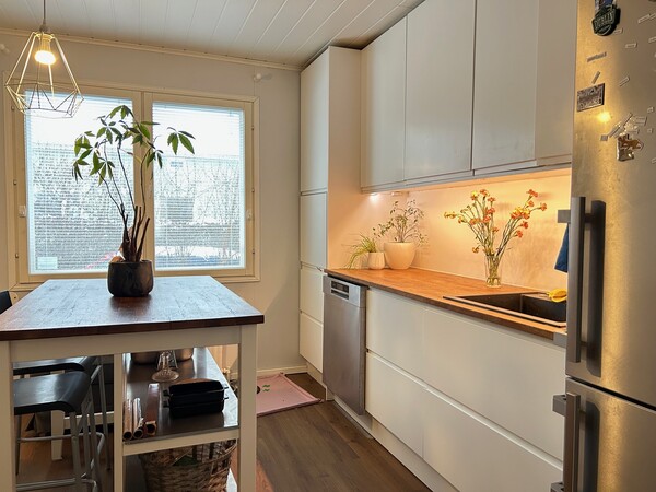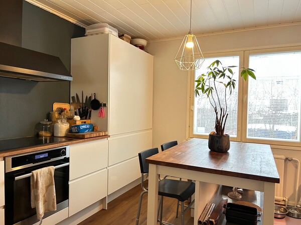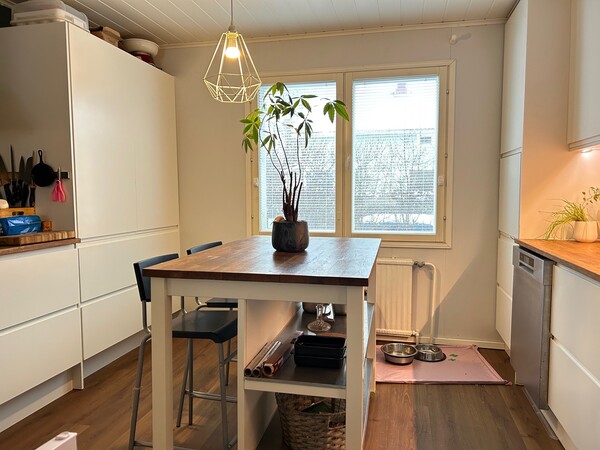 Keittiö on uusittu 2020, on tammitasot ja löytyy aamiaiskaappi. Keittiön seinä on avattu olohuoneeseen päin.