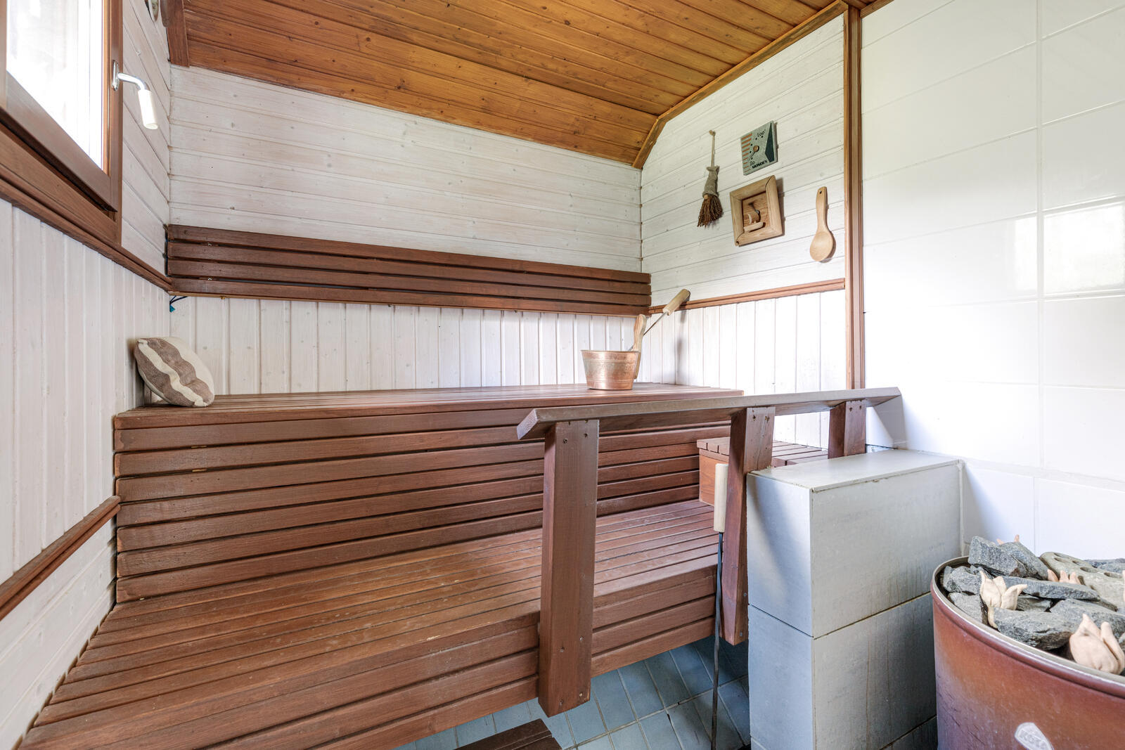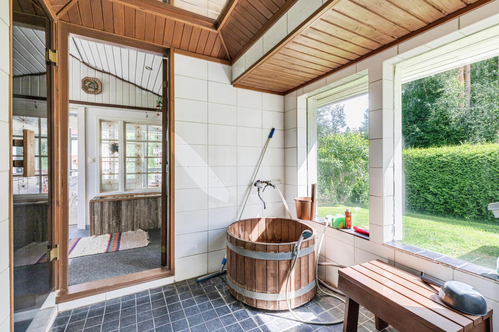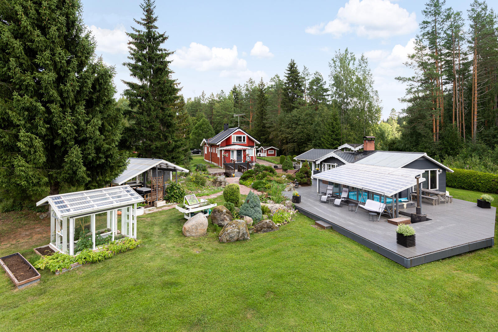 Saunarakennuksessa viihdytät kesävieraat ja ystävät mennen tullen. Hulppean kokoisella terassilla on katettu uima-allas. Suodatinjärjestelmällä varustellun altaan vesi lämpenee näppärästi puilla. Saunan- ja pesutilojen lisäksi rakennuksesta löytyy lasitettu terassi sekä yksi huone. Toisessa päädyssä on grillaus- /oleskelualue. Tiluksilta löytyy paljon muutakin, mm. autokatos/-talli pajalla, leikkimökki, kasvihuone ja vaja.