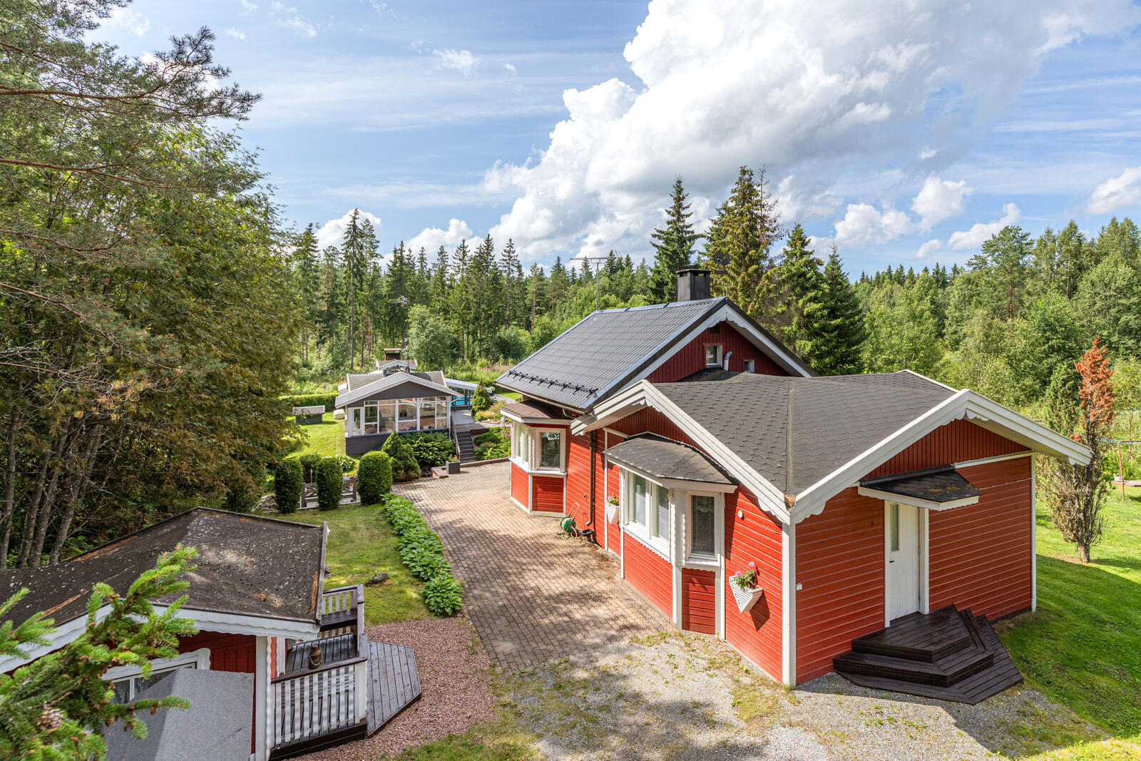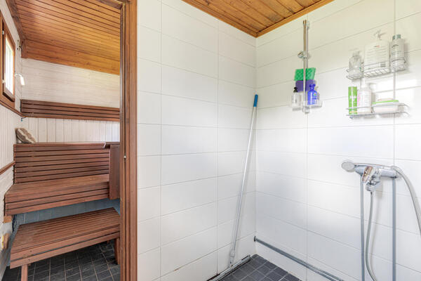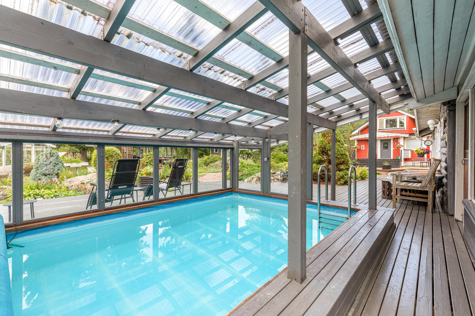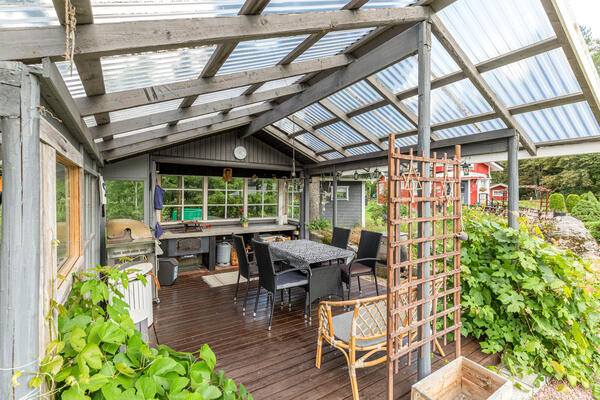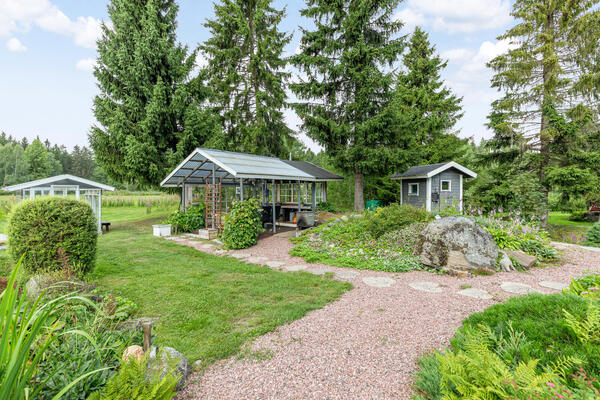 Saunarakennuksessa viihdytät kesävieraat ja ystävät mennen tullen. Hulppean kokoisella terassilla on katettu uima-allas. Suodatinjärjestelmällä varustellun altaan vesi lämpenee näppärästi puilla. Saunan- ja pesutilojen lisäksi rakennuksesta löytyy lasitettu terassi sekä yksi huone. Toisessa päädyssä on grillaus- /oleskelualue. Tiluksilta löytyy paljon muutakin, mm. autokatos/-talli pajalla, leikkimökki, kasvihuone ja vaja.