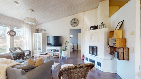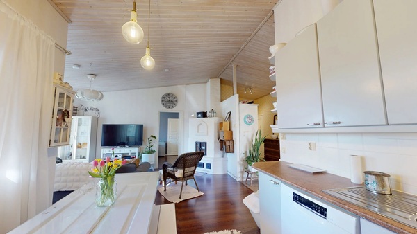 Olohuone ja keittiö muodostavat kivan kokonaisuuden, olohuoneen puolella on varaava takka.