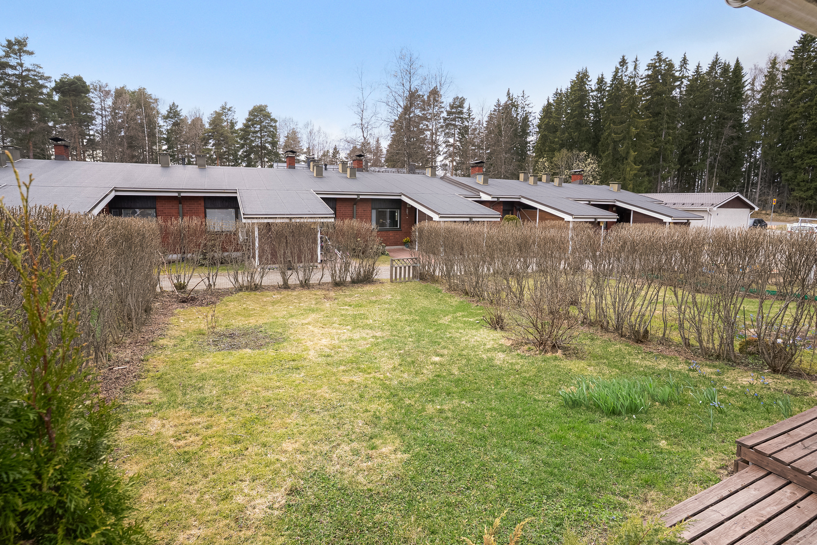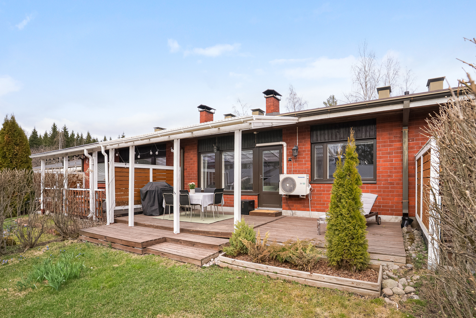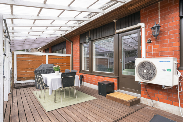 Asunnon katettu terassi jatkaa oleskelutilaa ulos ja tarjoaa suojaisan paikan nauttia kesäpäivistä. Aurinkoinen oleskelupiha kutsuu viihtymään ja sopii mainiosti niin rentoutumiseen kuin yhdessäoloon.