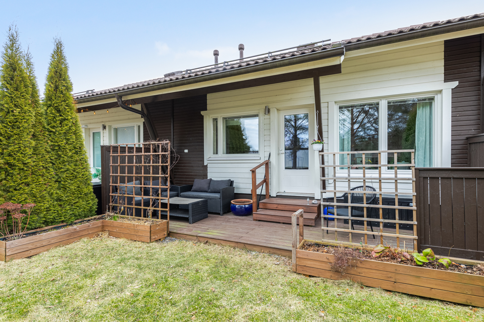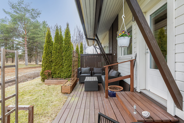 Takapiha rajoittuu suoraan puistoalueeseen, tarjoten rauhaa ja vehreyttä ilman naapureita takana. Ilta-auringon suuntaan avautuva piha on täydellinen paikka rentoutumiseen ja kesäilloista nauttimiseen.