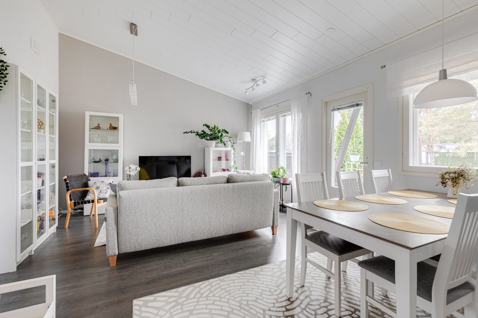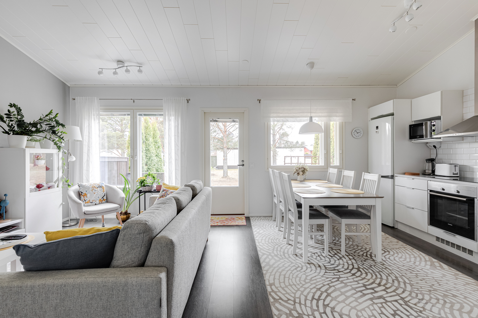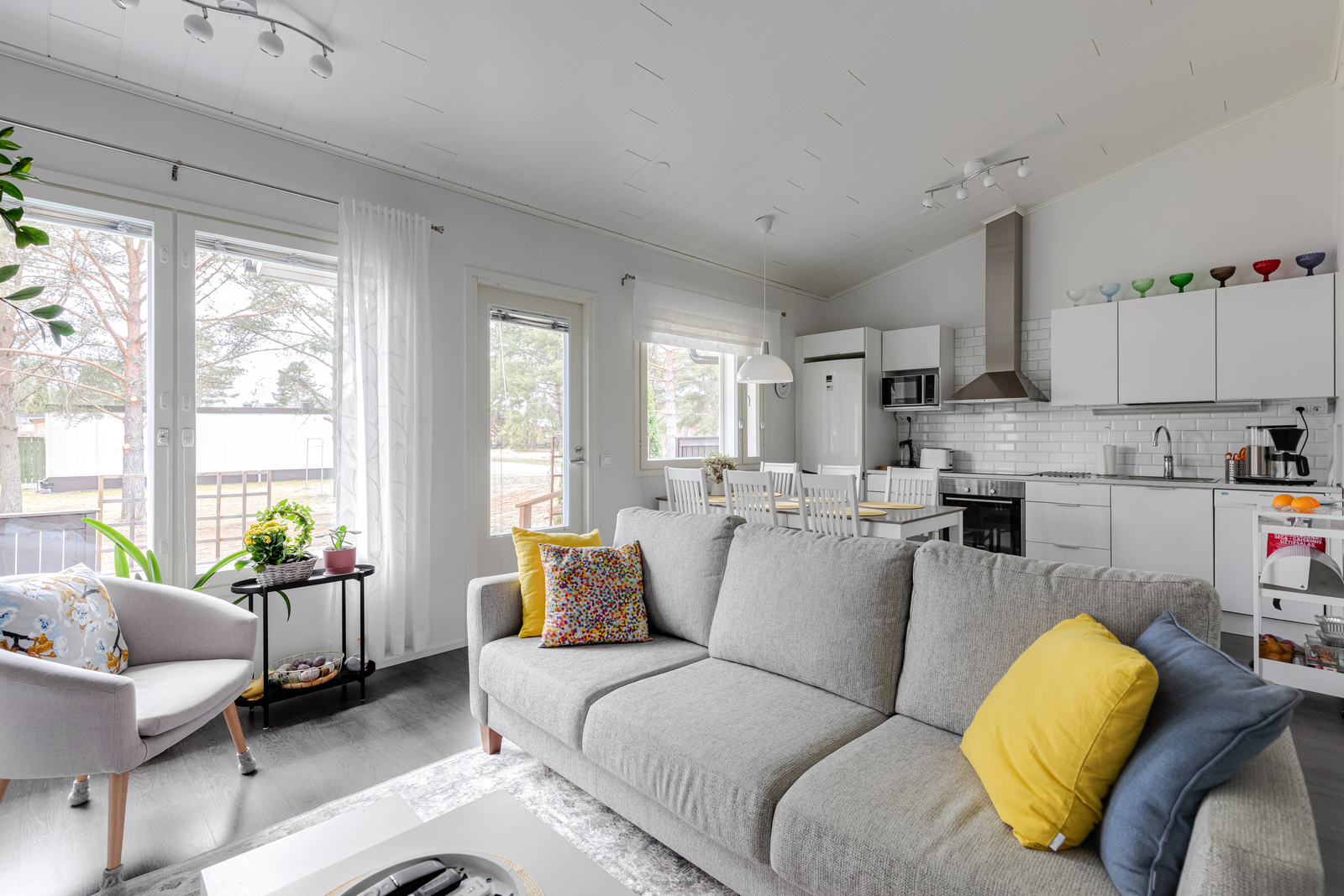 Asunnon sydämen muodostavat avara olohuone ja keittiö, joissa harjan suuntainen sisäkatto tuo tilaan näyttävyyttä ja lisää tilantuntua.