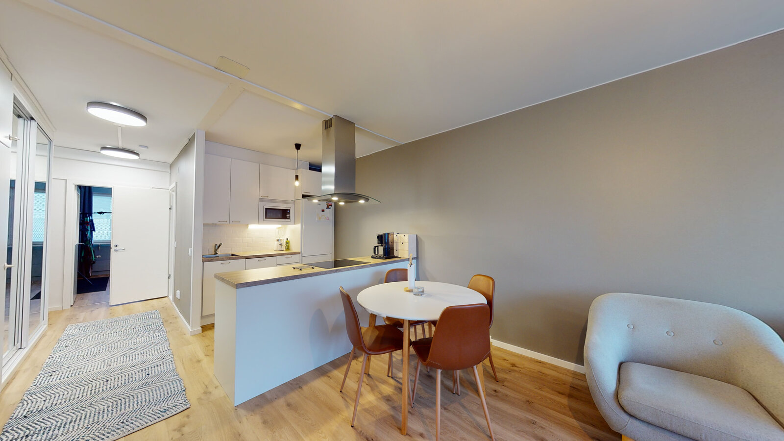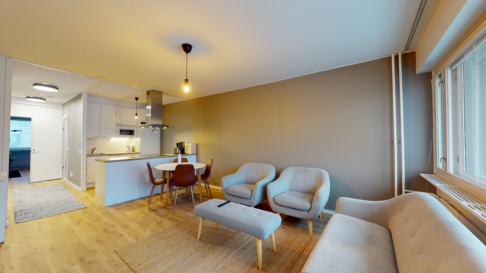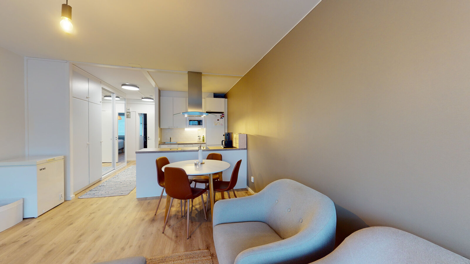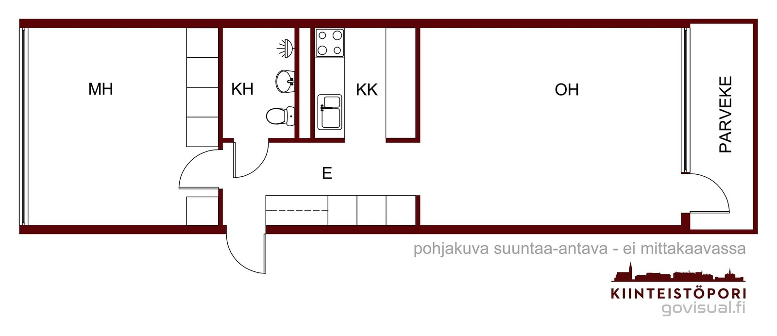 olohuone + avokeittiö + saareke, makuuhuone, suihkuhuone/wc, lasitettu parveke